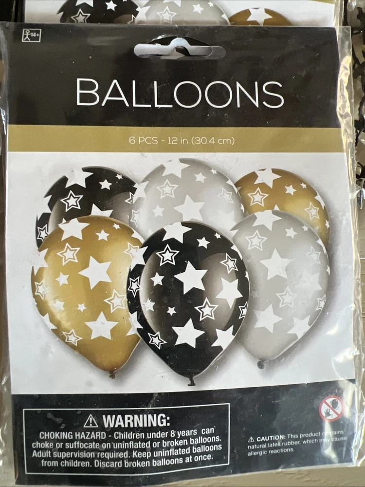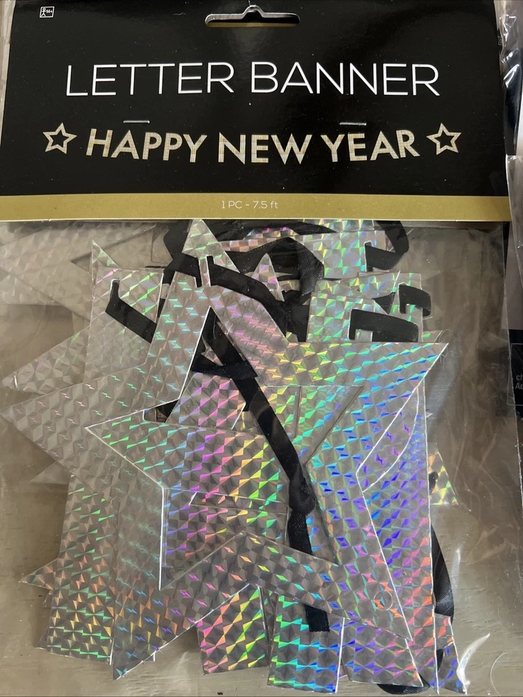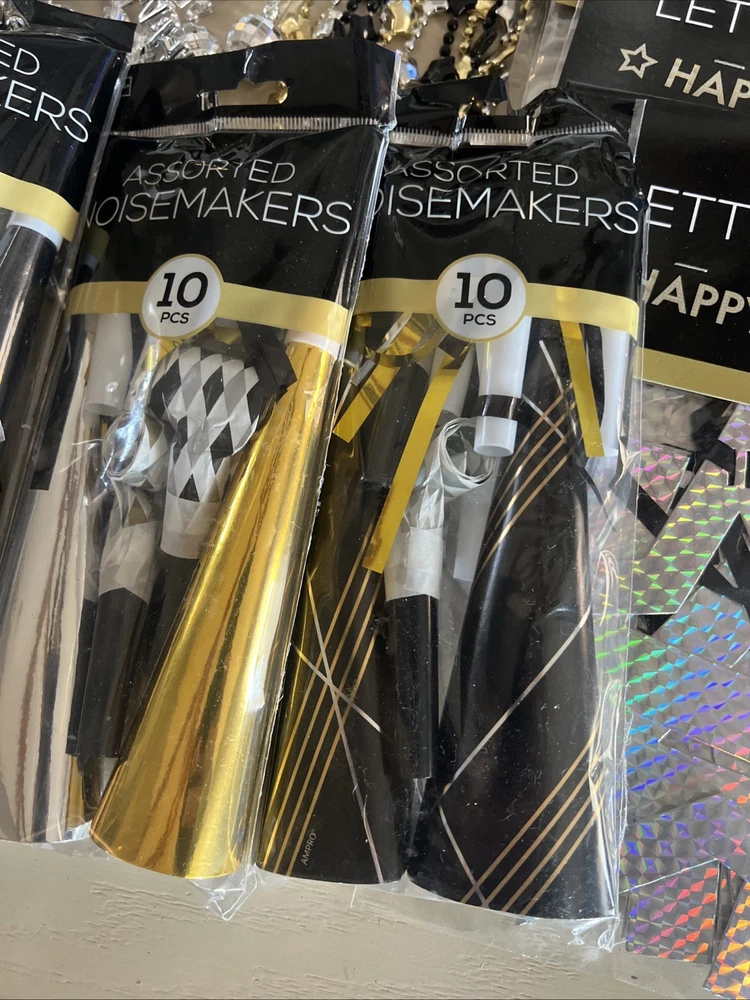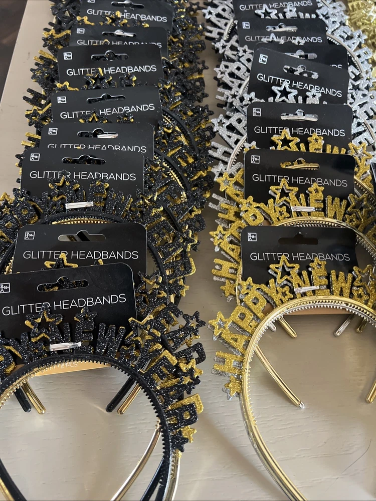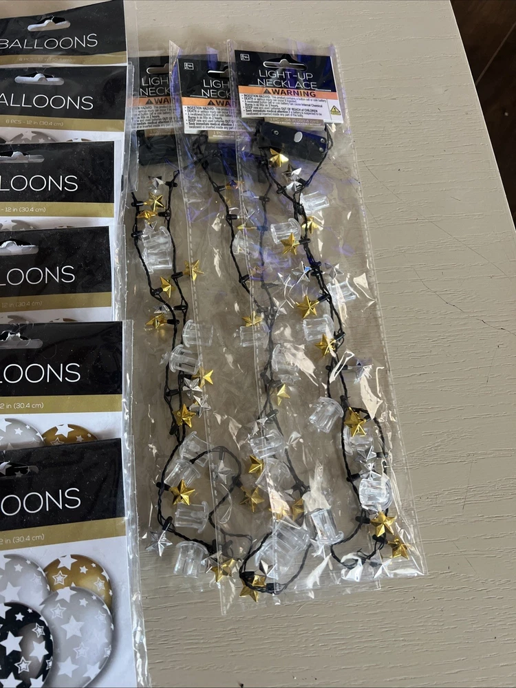 Large lot for New years Eve celebration. 22~Black and Gold Glitter headbands. Total. 6~Gold and Silver Glitter headbands. Total. 14~ Silver and Black Glitter headbands. Total. 50 ~Total Noisemakers. 18 ~Total Bead Necklaces. 7~ Happy New Years Banners. 6 packages of air filled balloons. ( 6 per pack. 36 total Balloons) 3~ Light up necklaces Total. New and in packages. 156 total individual pieces included .