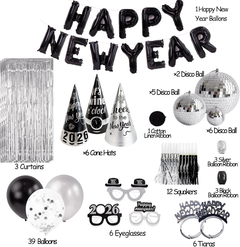 Complete 98-Piece Party Kit – Includes “Happy New Year” letter balloons, 3 silver fringe curtains, 13 disco balls, 39 balloons, 6 hats, 6 headbands, 6 glasses, and 12 noisemakers. 16" HAPPY NEW YEAR – Bold black letters serve as the centerpiece and elevate your New Year’s Eve decor. Shimmering Disco Balls - Add retro flair while reflecting light beautifully, creating sparkling highlights that elevate your New Year’s decor. Photo Booth Ready - Complete backdrop and props set creates a festive photo spot with sparkling decor and fun accessories. Black and Silver Theme - Bold black with shimmering silver accents adds sleek elegance and creates a sophisticated New Year’s Eve atmosphere. Product description The video showcases the product in use. The video guides you through product setup. The video compares multiple products. The video shows the product being unpacked. 98 Pcs Sets With Happy New Years Decorations 2026 Merchant Video