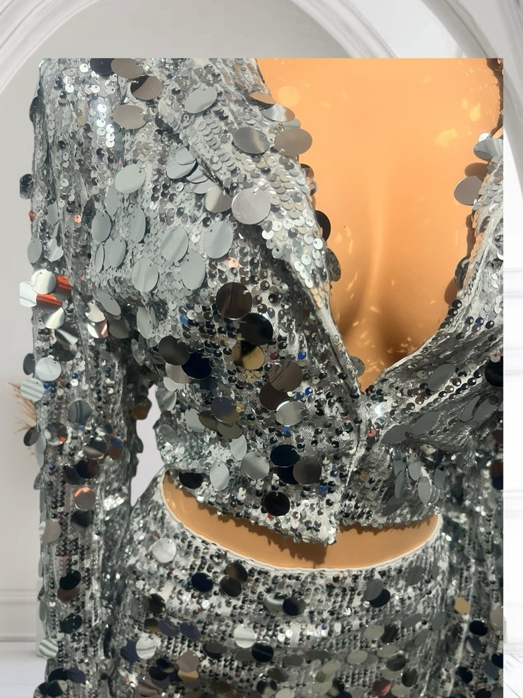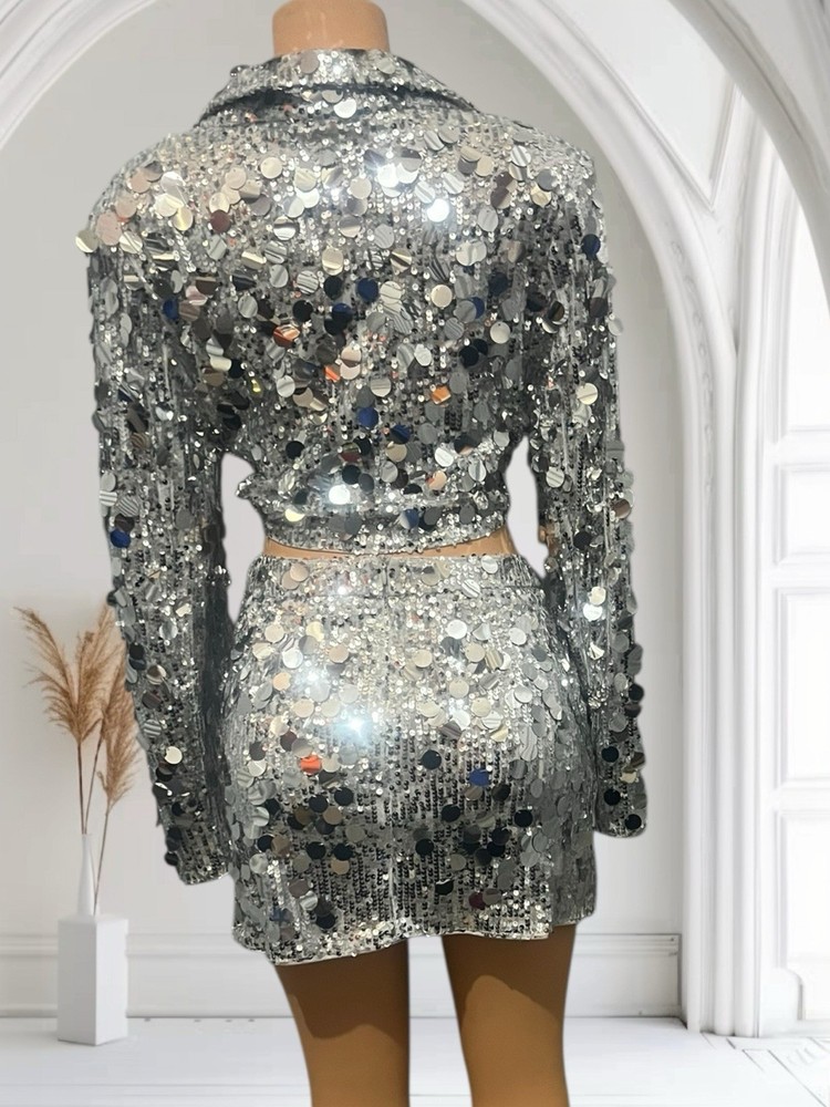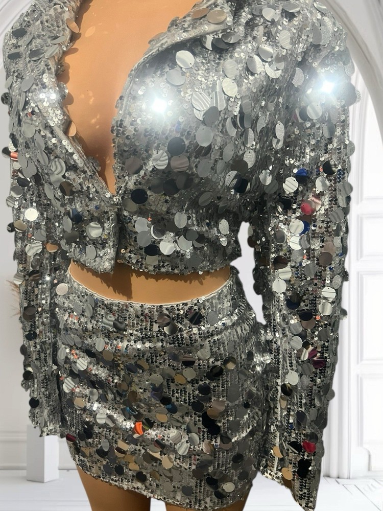 Shine bright in this gorgeous silver sequin two-piece set! ✨ Featuring a cropped sequin jacket with a deep neckline and a matching high-waisted mini skirt, this outfit was made to steal the spotlight. Perfect for a girls’ night out, holiday parties, birthdays, or any event where you want to turn heads. Details: • Condition: New with Tags (NWT) • Size: Large • Color: Silver • Fabric: Sequin stretch fabric (comfortable fit with flexibility) • Pieces: 2-piece set — long sleeve crop jacket + mini skirt • Fit: Slim fit with good stretch for movement • Occasion: Clubwear, Party, Special Event, Birthday, NYE, or Girls’ Night Out • Style Notes: Fully lined for comfort; front zipper jacket closure Care: Hand wash cold or professional dry clean recommended