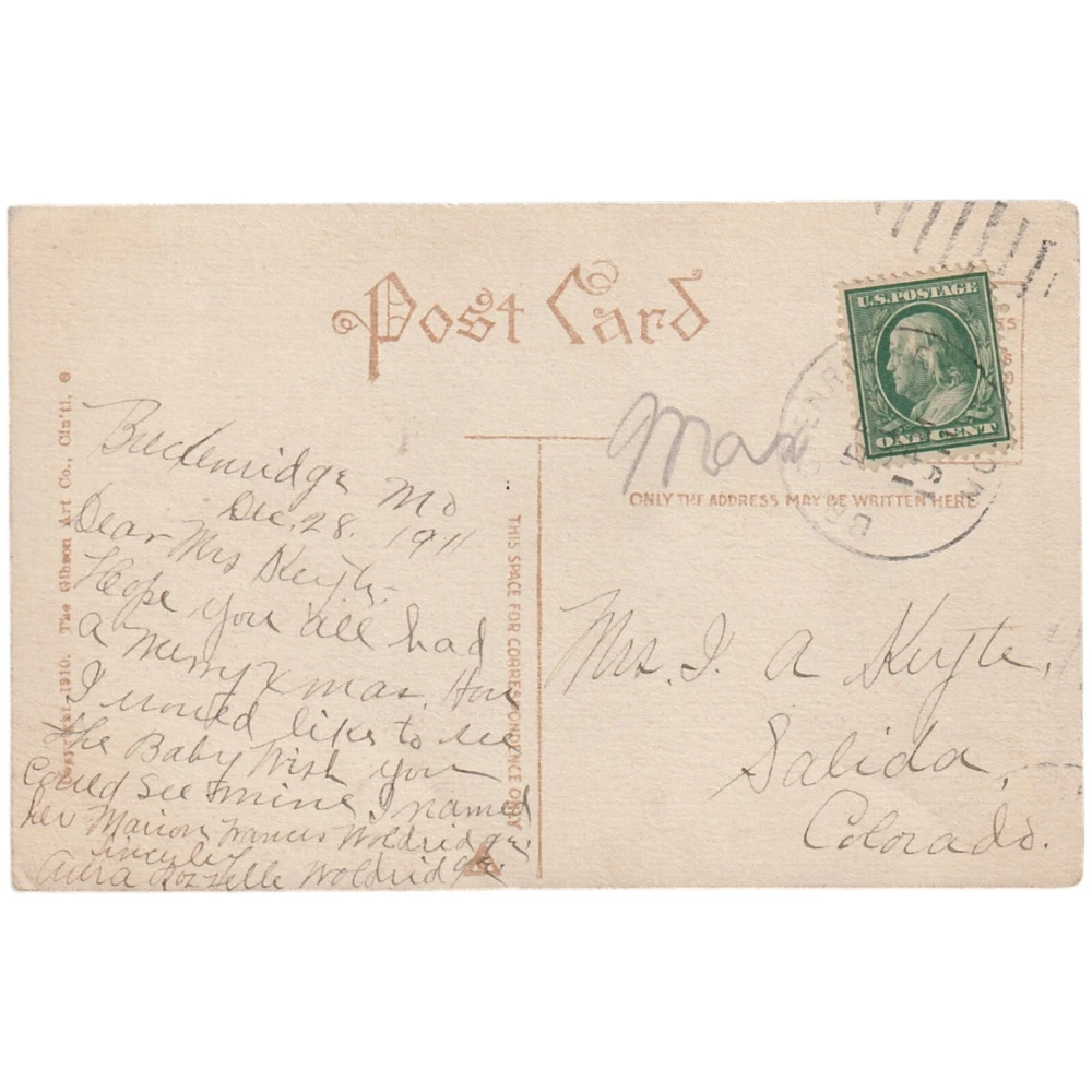 This vintage postcard from 1910 features Cupid, the god of love and desire, holding a large bag of money with the Bank of Success written on it. The hand-colored lithograph print, manufactured by Gibson Art Co. in Germany, is in standard size (5.5x3.5 in) and is an original, not a licensed reprint. The postcard has been posted before and is in good condition for its age, with no signs of damage or wear. The postcard is perfect for collectors of vintage holiday-themed memorabilia, especially those interested in New Year's celebrations. It would also make a great gift for someone who is looking for a unique piece of art to decorate their home. Personalization is available upon request, with instructions provided by the buyer