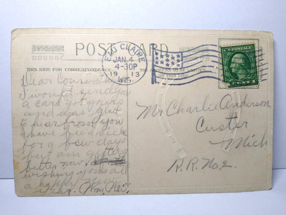 Posted with 1913 cancel. Marked John Winsch. Antique original vintage embossed post card. Has tiny edge tears, soiling, corner creases, and age wear. Stock #ny134. Additional postcards are in our store. All post cards are old originals and may or may not have writing on back. Bundle and save by using cart and making single payment.