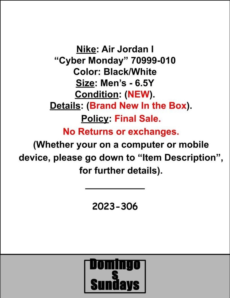 Nike : Air Jordan I “Cyber Monday” 709999-010 Color: Black/White Size : Men’s - 6.5Y Condition : ( NEW ). Details : ( Brand New In the Box ). Policy : Final Sale. No Returns or exchanges. (Whether your on a computer or mobile device, please go down to “Item Description”, for further details). __________ 2023-306