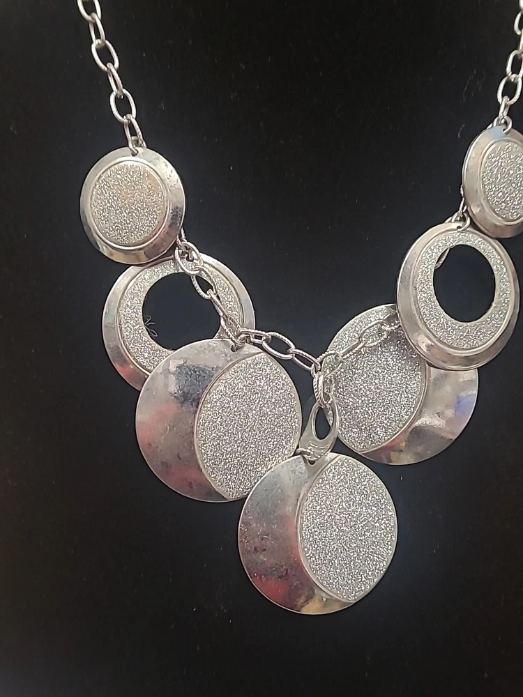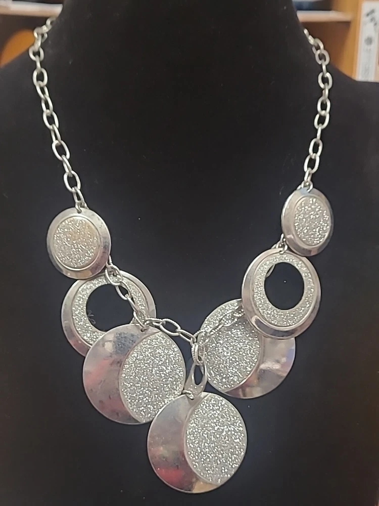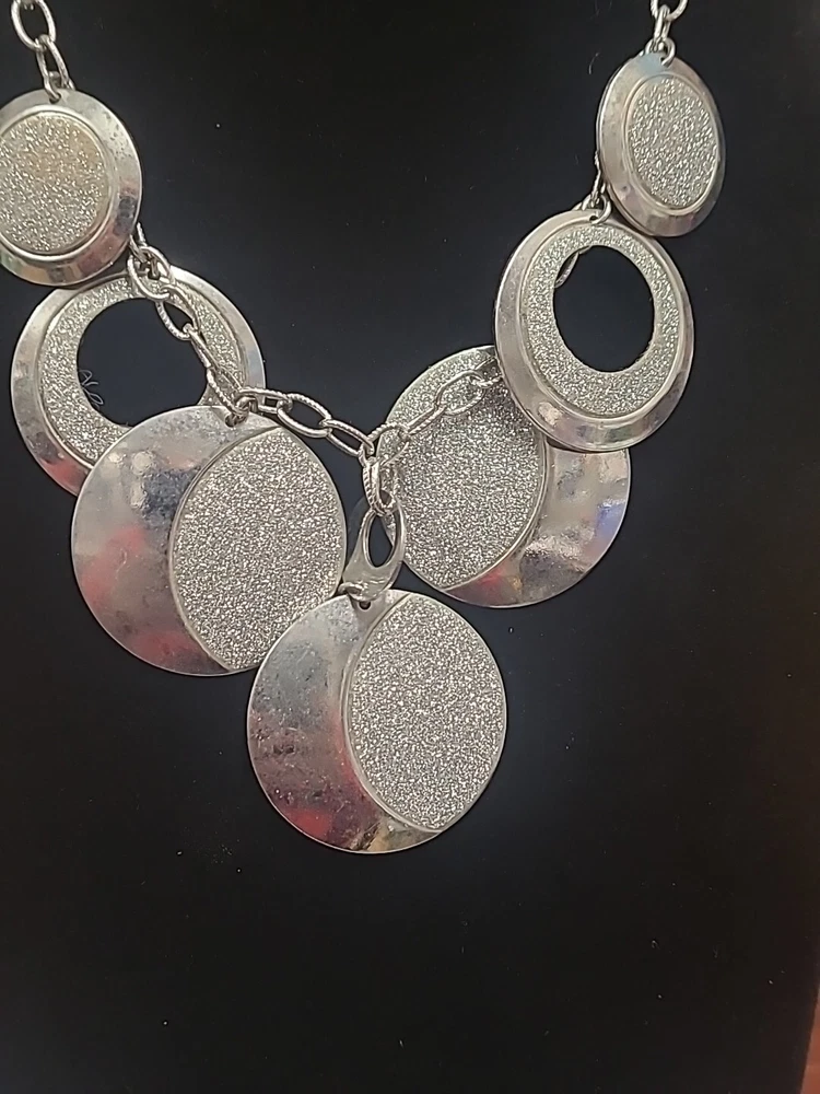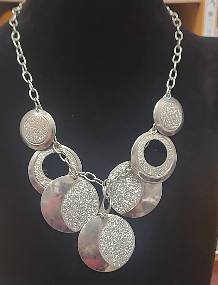 New York And Company Necklace Silvertone Statement Circles . Condition is Pre-owned. Shipped with USPS Ground Advantage.