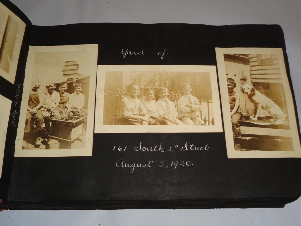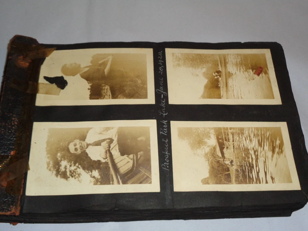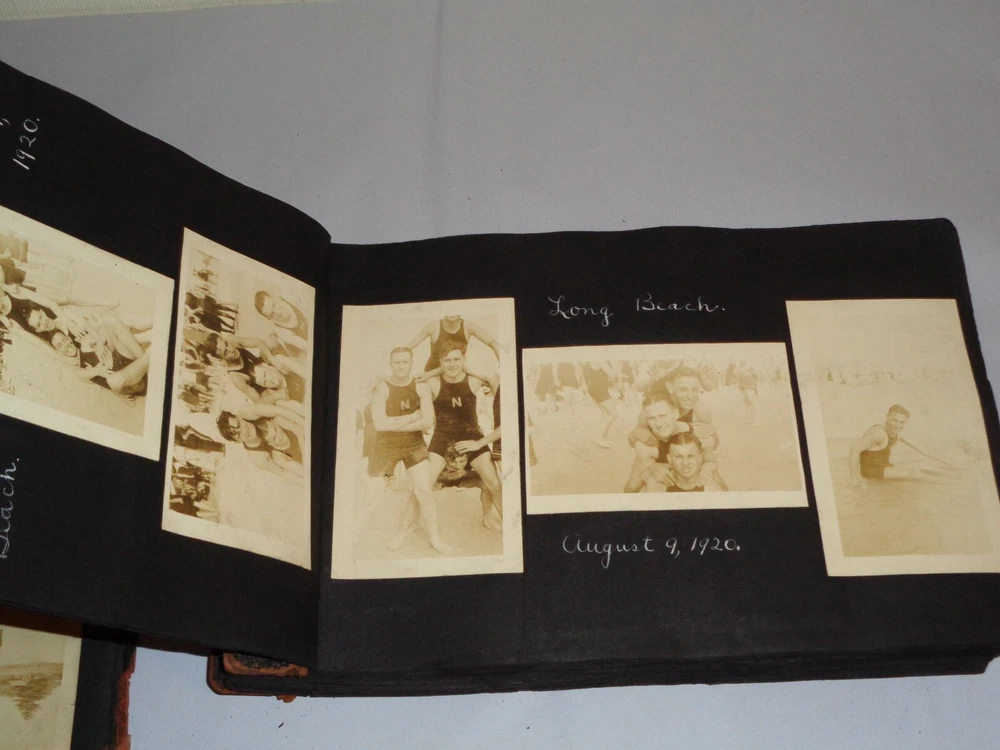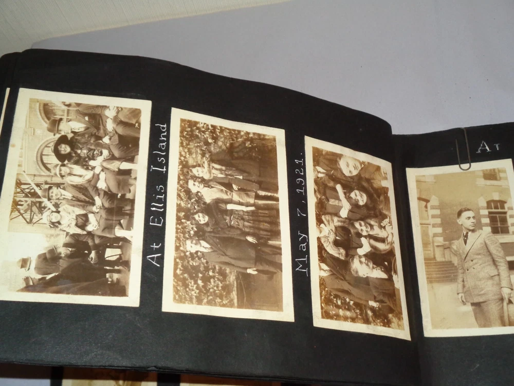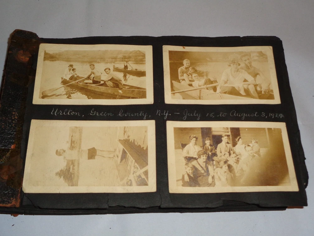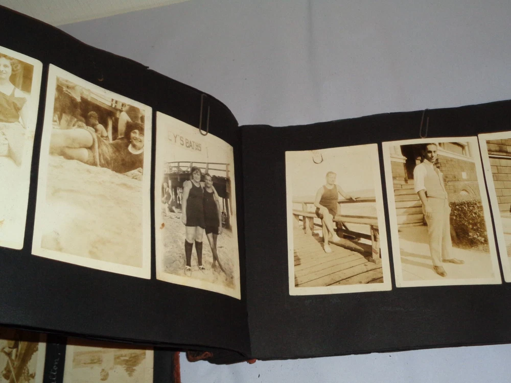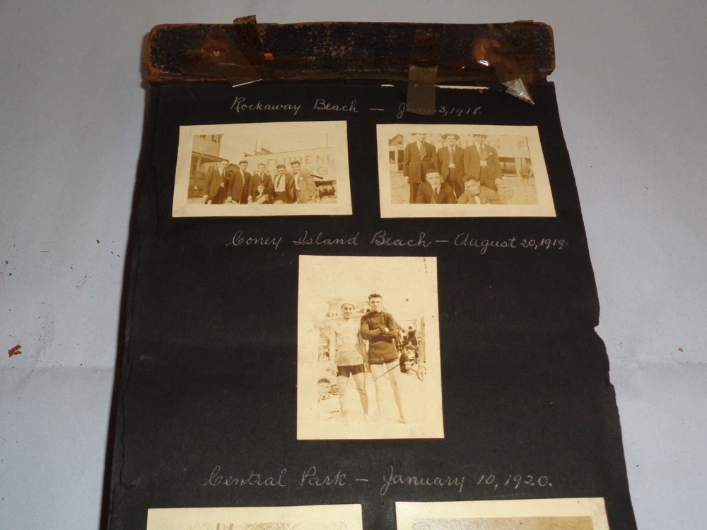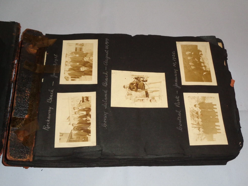 Antique Original 1920s New York City & Area Rare Photo Album - Over 400 Photos Many pages have information written on them to include the location and date. On the first page, it states that the album begins in June 1920, but photo captions indicate that the earliest is from 1918 and the latest date that I can find is 1921. Locations include Brighton Beach, Ellis Island, Brooklyn, Hudson River, Neversink, Far Rockaway, Long Beach, Coney Island, Prospect Park, Rockaway Beach, Central Park, and more. Photos are mostly of people, friends, and family at various locations mentioned above. One of the photos is of Ellis Island Commissioner Frederick Wallis. As you go through the book, you see that the caption information stops, and there is no longer dates and places written on pages. There are approximately 441 Photos altogether, give or take, and two photo negatives. The photos are affixed to the pages. There are over 125 pages. The album itself measures about 7" x 11 3/8". Photos measure from 1 7/8" x 2 7/8" (smallest) to 2 3/4" x 4 3/4" (largest). There are around 10 blank pages in the back of the album. This album is in antique condition and is extremely fragile. The front cover is loose, and there is no back cover. There are additional loose pages in both the front of the album and in the back. There is heavy cracking, discoloration and wear to the front cover. There are stray pieces of tape on the cover and on the binding, where it appears someone tried to tape the front cover on. Note that there is edge chipping, tearing, cracking, missing corners, discoloration, and other wear throughout the book. There are paperclips randomly dispersed throughout as well, and these paperclips are rusted, leaving a mark on photos it touched. Some pages are cracked around the photos, such on the page of Commissioner Frederick Wallis (see photo). There is also an old storage-type scent, which is understandable. Overall, this album needs to be handled with care and should be historically preserved. Please see photos for more information on condition and ask any questions you may have. This would be a nice addition to any collection.