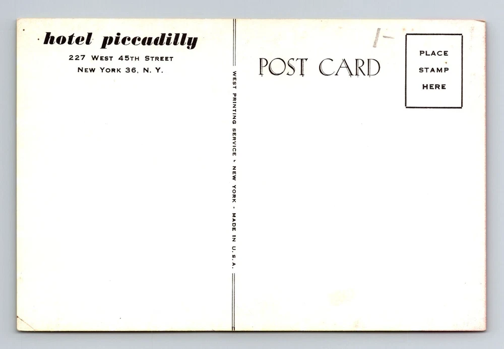 New York City, Hotel Piccadilly, Advertising, Antique Souvenir Vintage Postcard