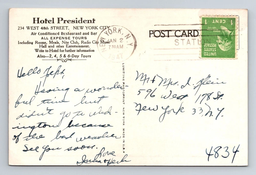 New York City, Hotel President, Advertising, Antique Souvenir Vintage Postcard