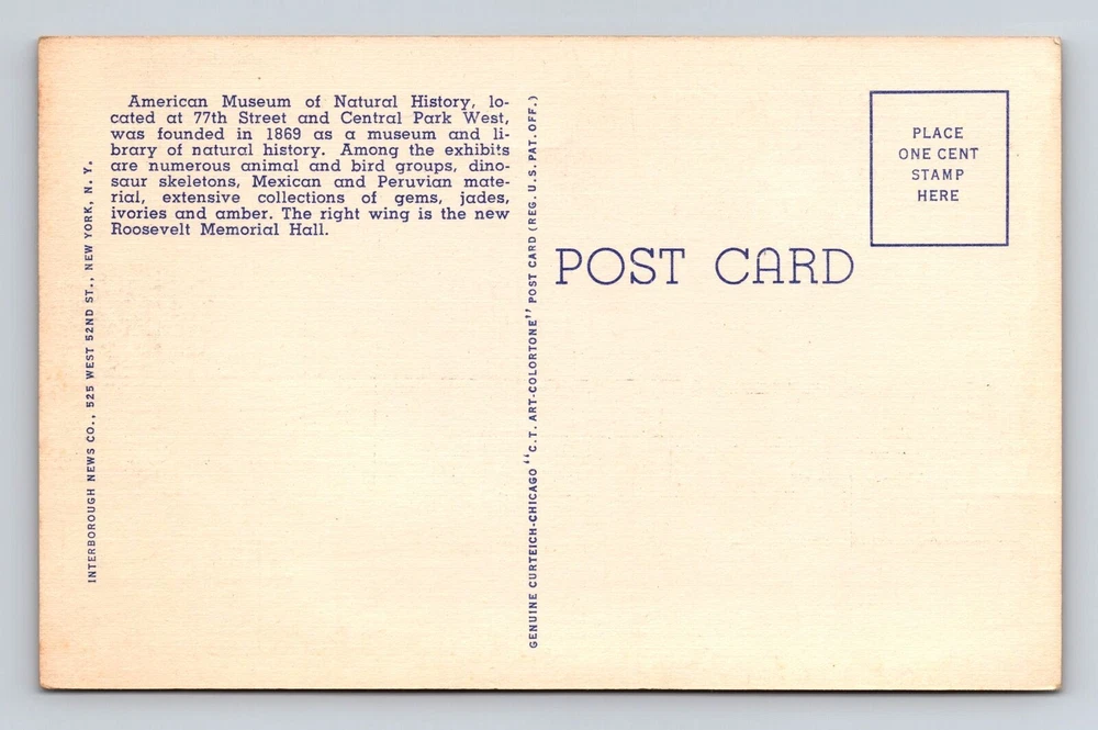 New York City NY, American Musuem Of Natural History, Vintage Souvenir Postcard