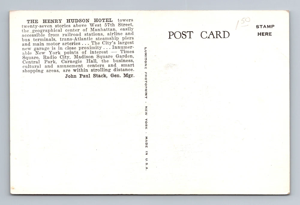 New York City NY, Henry Hudson Hotel, Souvenir, Vintage Postcard