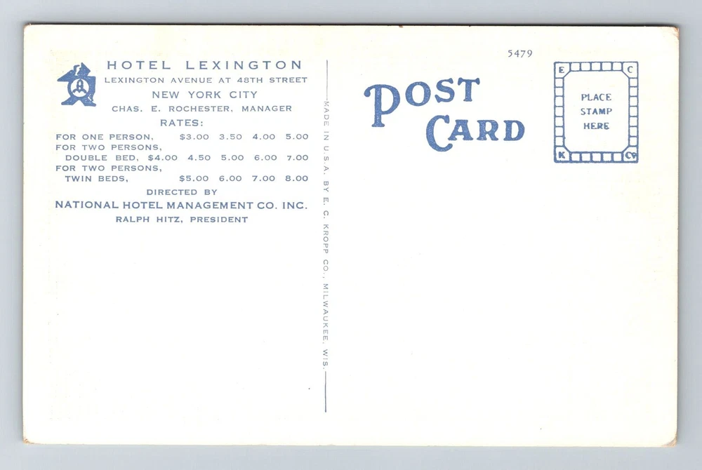 New York City NY, Hotel Lexington Antique Vintage Souvenir Postcard