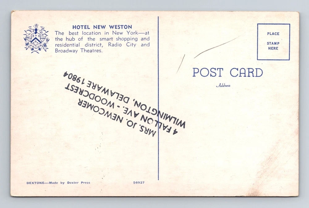 New York City NY, Hotel New Weston, Souvenir, Antique, Vintage Postcard