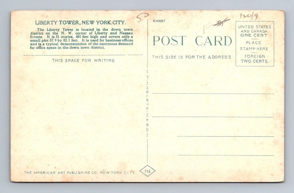 New York City NY, Liberty Tower, Souvenir, Vintage Postcard