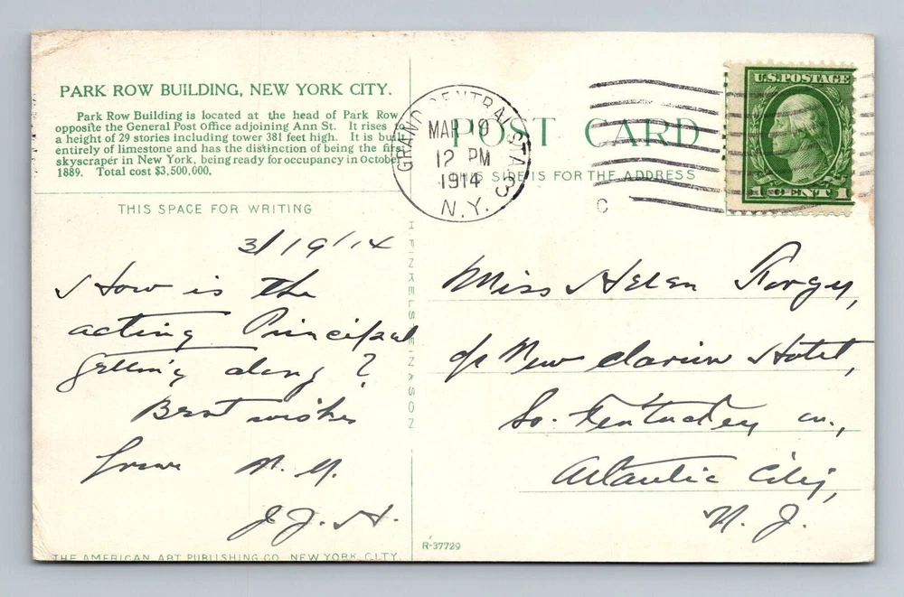 New York City NY,, Park Row Building, c1914 Vintage Souvenir Postcard