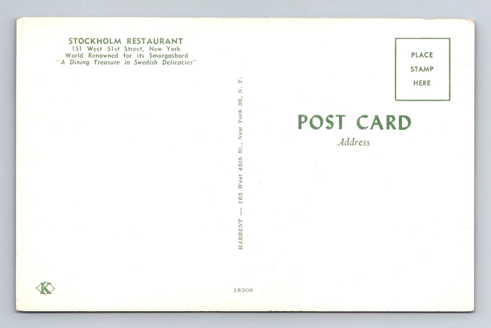 New York City NY, Stockholm Restaurant, Souvenir, Antique, Vintage Postcard