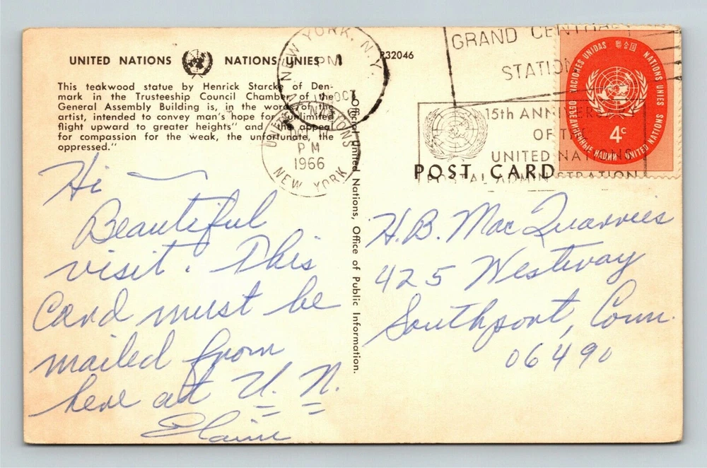 New York City NY,, United Nations Statue, c1966 Vintage Souvenir Postcard