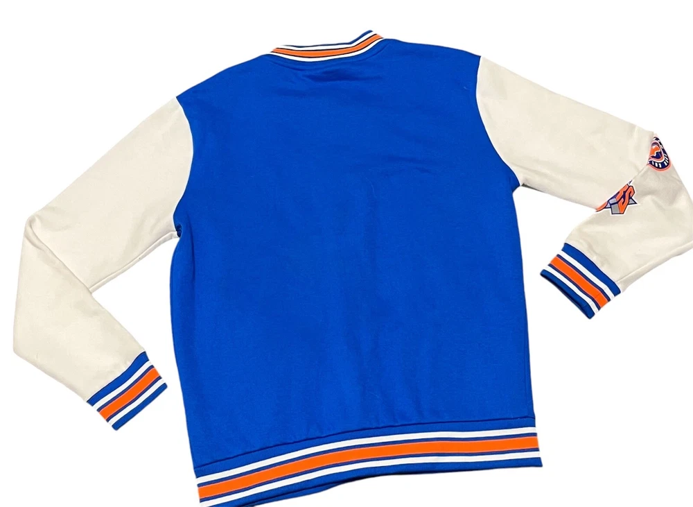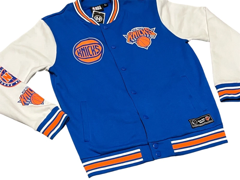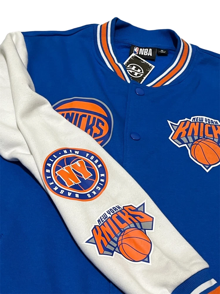 This is a NBA Team Apparel New York Knicks Jacket in size M for unisex adults. It features a multicolor animal print design, with an adjustable waist and a 22-inch inseam. Made from cotton canvas fabric, the jacket has a regular fit and ankle style. It is machine washable and suitable for winter, fall, and spring seasons. Perfect for activewear, it is ideal for gym training, golf, baseball, basketball, and football.