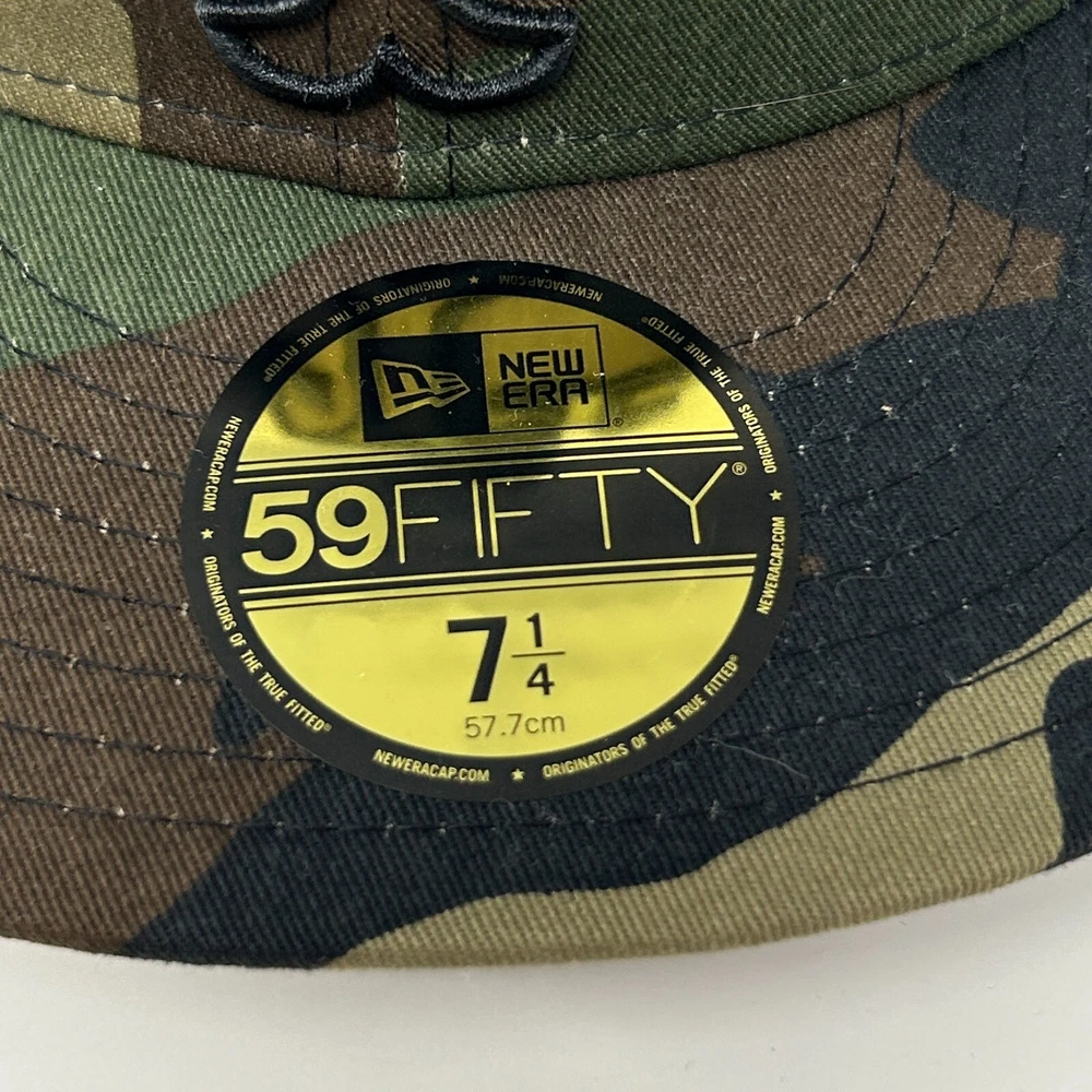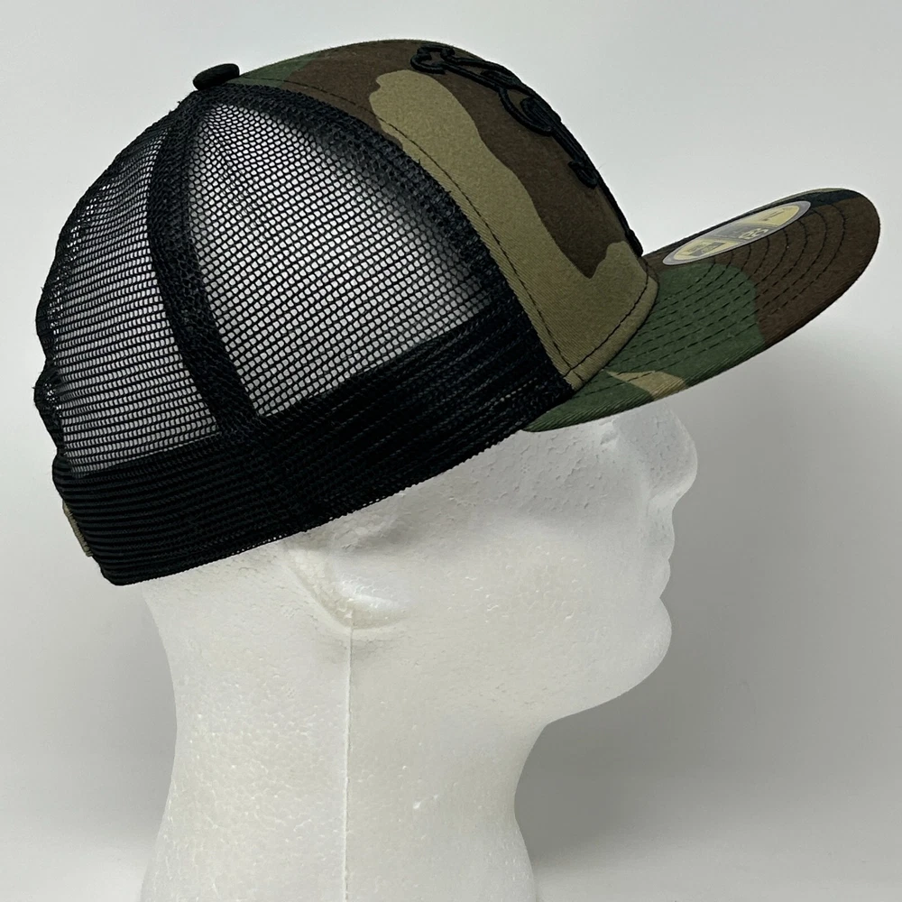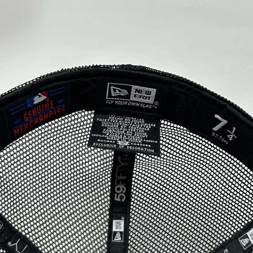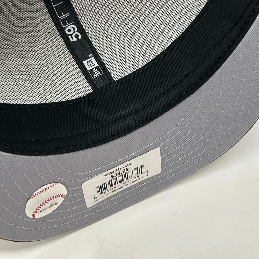New York NY Yankees Camo Trucker Hat Baseball Cap Fitted 7 1/4 New Era 5950 59Fifty MLB Army Military Camouflage Mesh Back Six Panel Black Will be shipped in a box. CONDITION: Has minor staining on the sweatband. No other flaws noticed. Has been cleaned and sanitized. See photos.