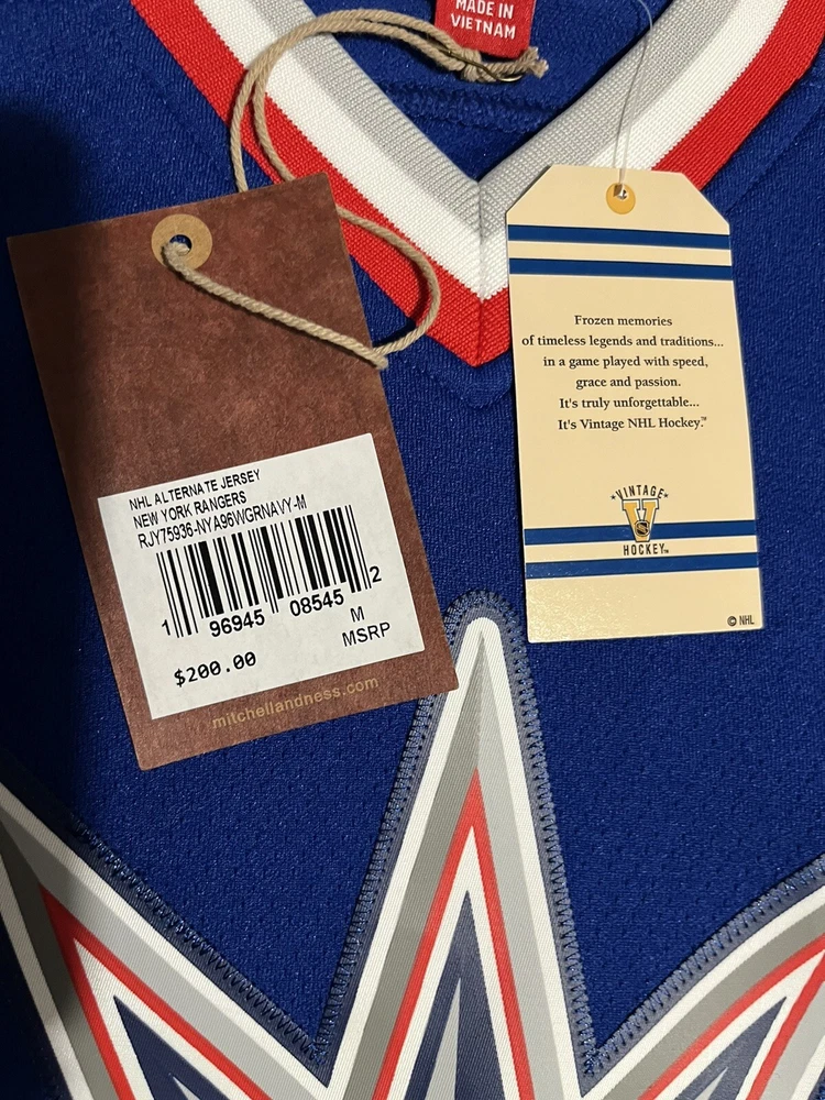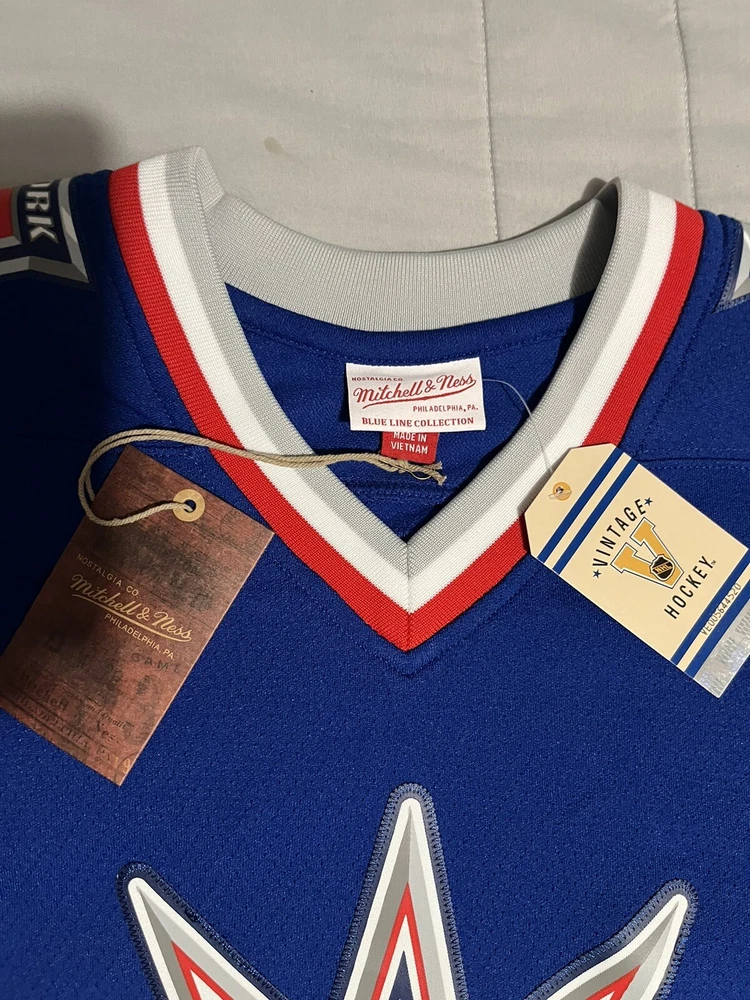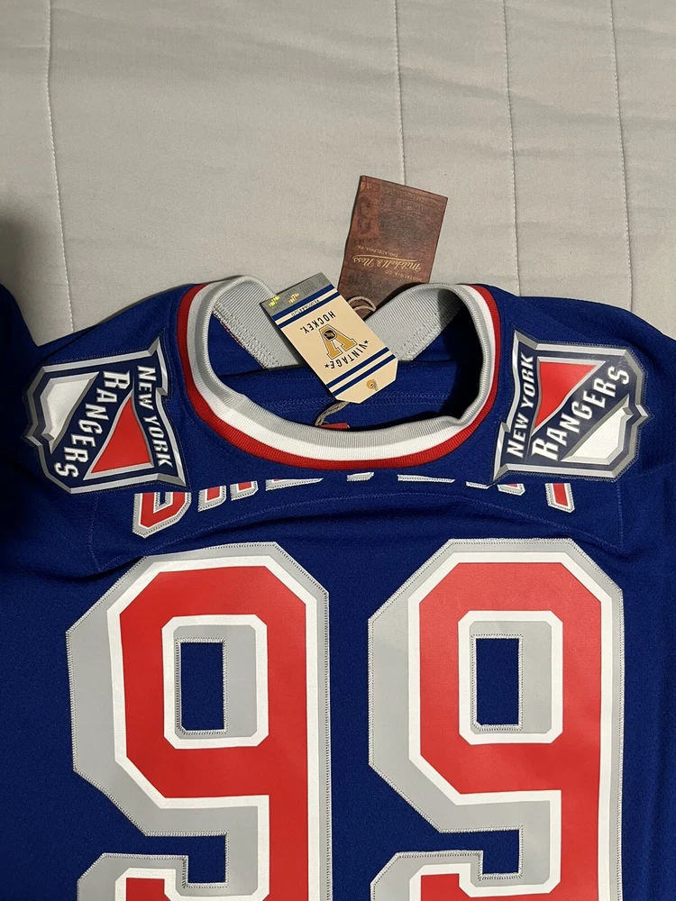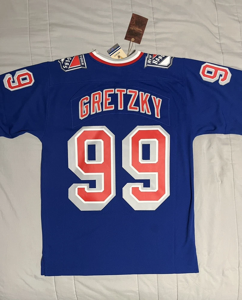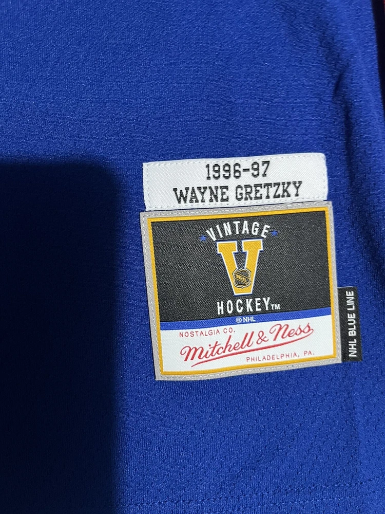 Show off your love for the New York Rangers with this Mitchell & Ness Blue Line 1996/97 jersey featuring the legendary Wayne Gretzky. The officially licensed NHL jersey is perfect for any fan looking to represent their team during the regular season. The blue color and classic design make it a stylish addition to any hockey fan's wardrobe. This men's size L jersey is made in Vietnam and has a capacity of 14 oz. It's an excellent gift for any fan of the sport or a great addition to your own collection. Get ready to cheer on the Rangers and relive the glory days of hockey with this authentic piece of fan apparel.