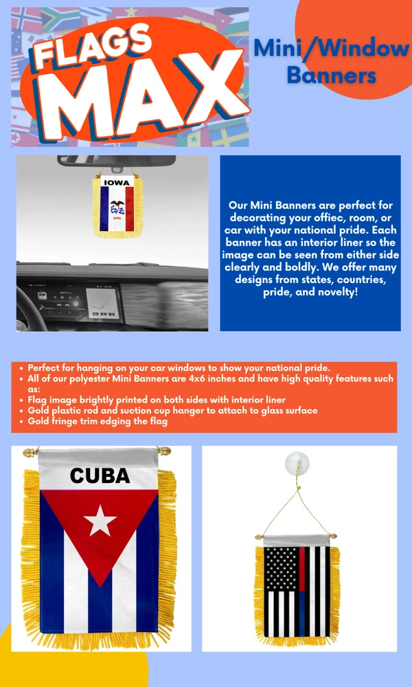 Brand:UnbrandedCountry/Region of Manufacture:ChinaStyle:TraditionalType:Mini Banner FlagMaterial:PolyesterItem Length:4x6inFeatures:Gold Fringe, Suction cup