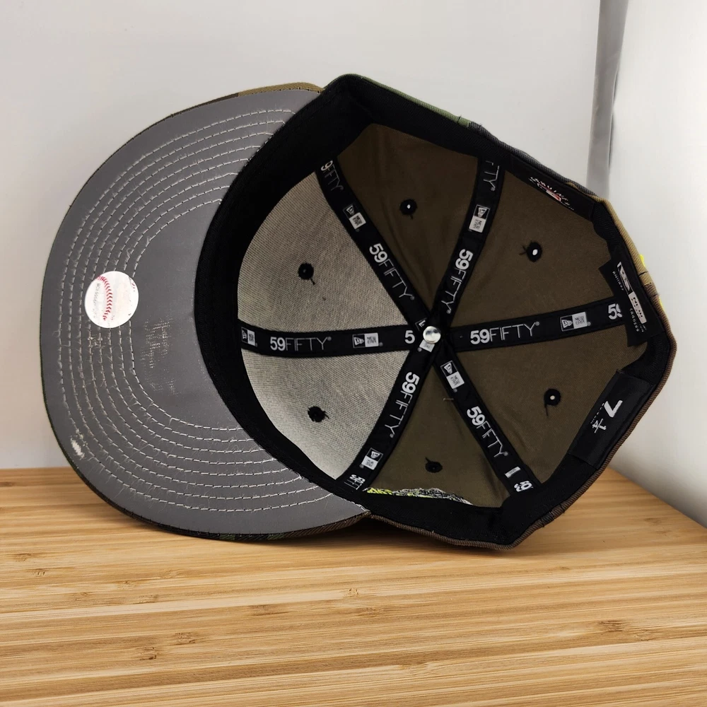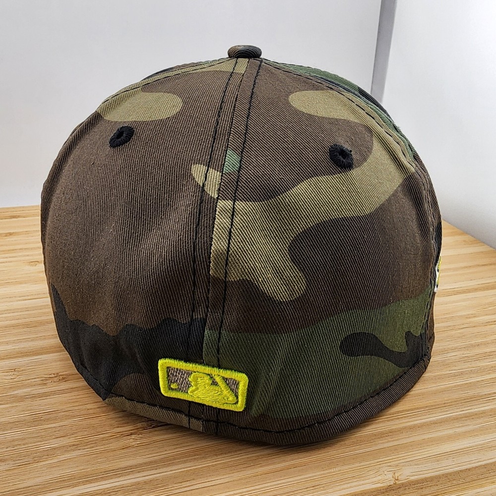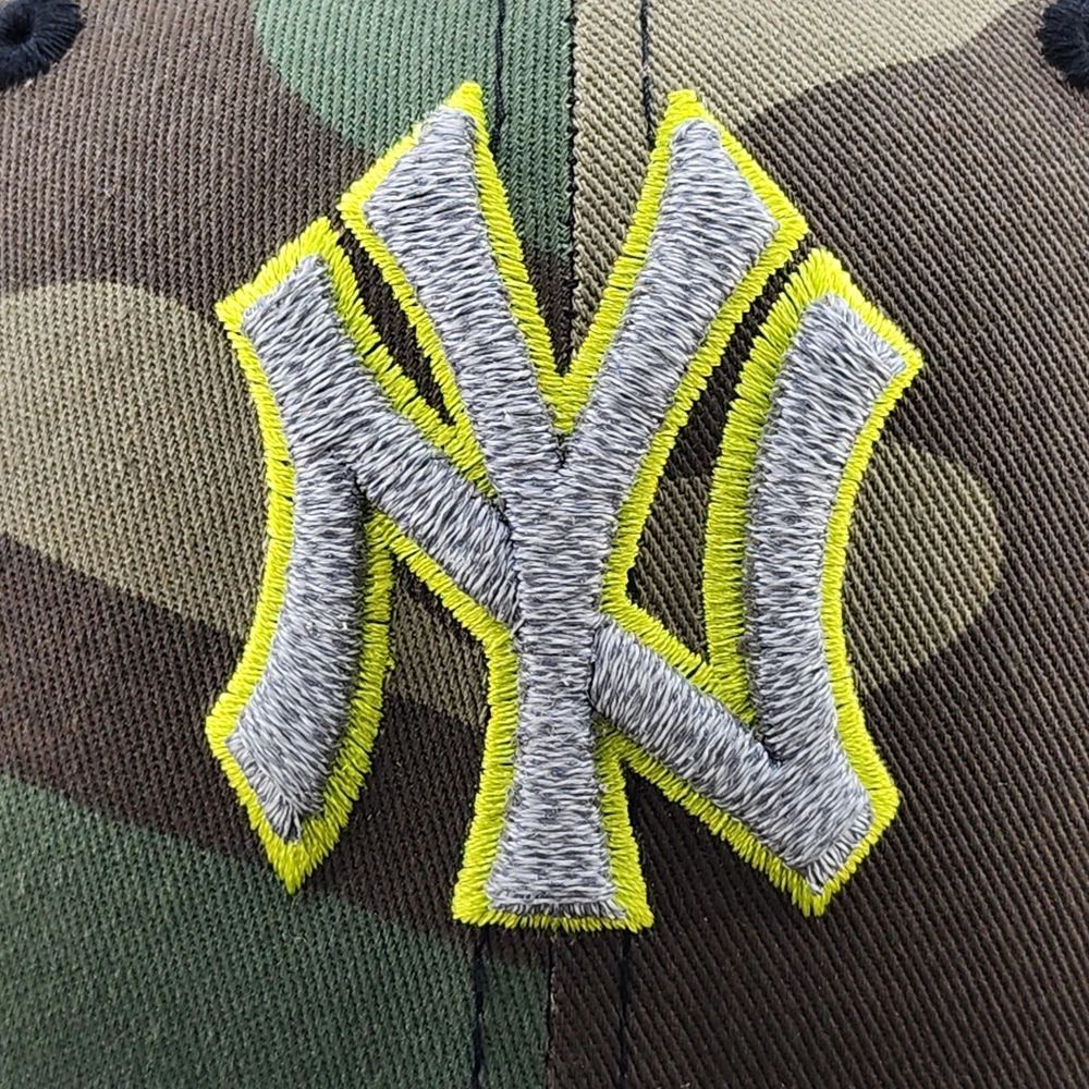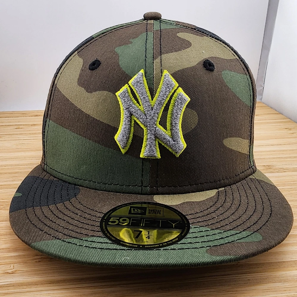 Show your support for the New York Yankees with this officially licensed New Era fitted hat. The camo design with neon highlights is perfect for any unisex adult fan. Made from high-quality materials in Bangladesh, this hat is a must-have for any Major League baseball enthusiast. The size 7 1/4 hat is perfect for a comfortable fit and features the iconic Yankees logo. Wear it to the game or simply as a fashion statement. Get your hands on this unique piece of fan apparel and show your love for the Bronx Bombers.