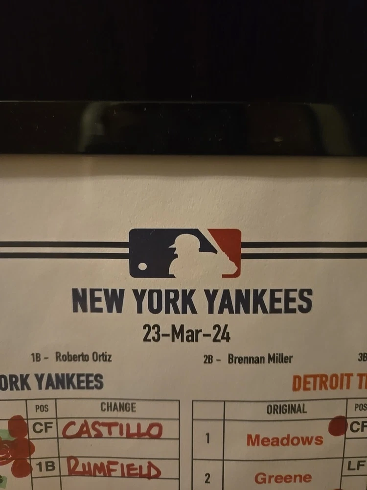 This is a unique opportunity to own a piece of baseball history. The New York Yankees Game-Used Lineup Card vs. Detroit Tigers 3/23/24 features Ben Rice, a talented player who has made a mark in the MLB, as well as other Tigers such as Javier Baez, Spencer Torkelson, and Riley Greene. This card is officially licensed, framed, and signed by Detroit Tigers player Bligh Madris, making it a valuable addition to any sports memorabilia collection. The card's dimensions are 11x17 inches, and comes shipped in a 12×18 inch frame. The card was used in the dugout of a game during MLB Spring Training, and it is a rare find for any fan of the sport. It is perfect for those who love the Yankees, Tigers, or baseball in general. This product type is MLB Game Used Lineup Cards, and it is a must-have for any collector.