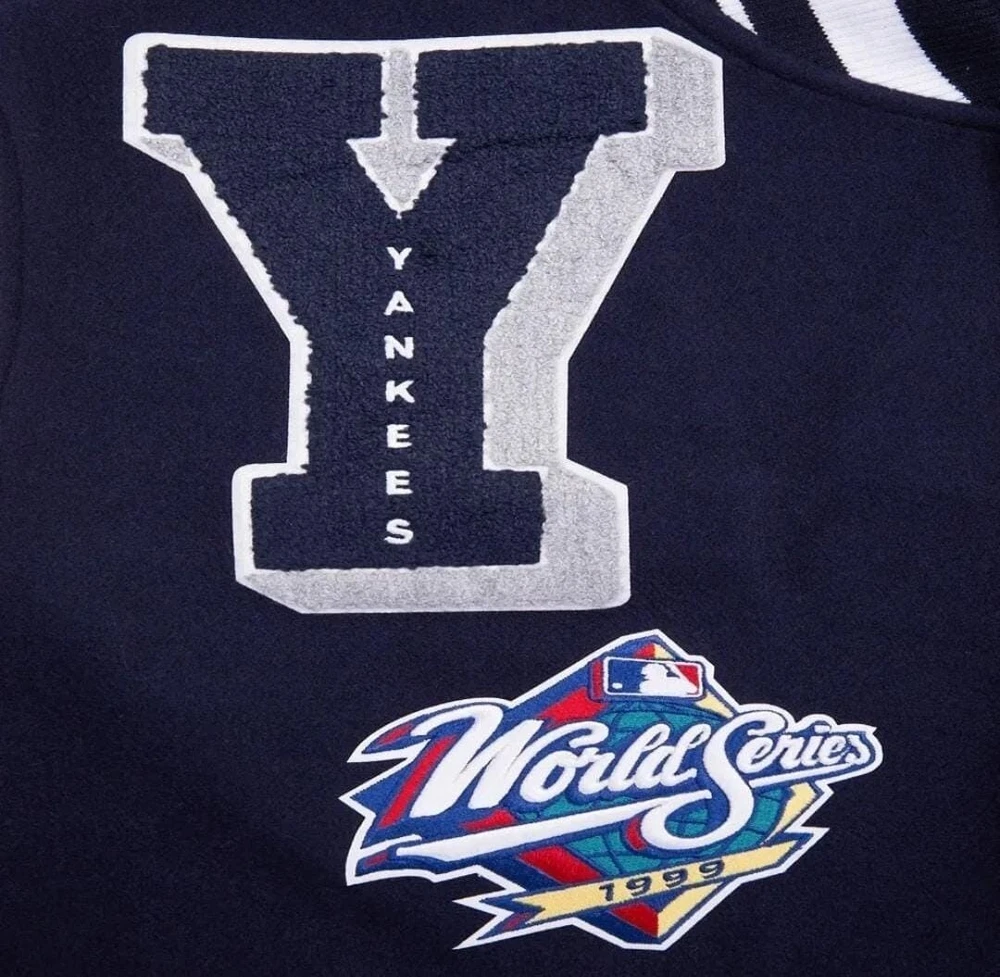 Show off your love for the New York Yankees with this stylish and unique varsity jacket. The jacket features a navy blue and white leather sleeve design with chenille embroidery that adds a touch of elegance to the overall look. It is made of high-quality wool and leather materials that ensure durability and comfort. This jacket is perfect for any baseball fan, especially those who support the New York Yankees. It is officially licensed and features the team's logo, making it a must-have for any fan. Whether you're going to a game or just want to show off your team spirit, this jacket is the perfect choice. NOTE ; Cuatom made jacket also available, send us your logo for custom jacket. Thanks