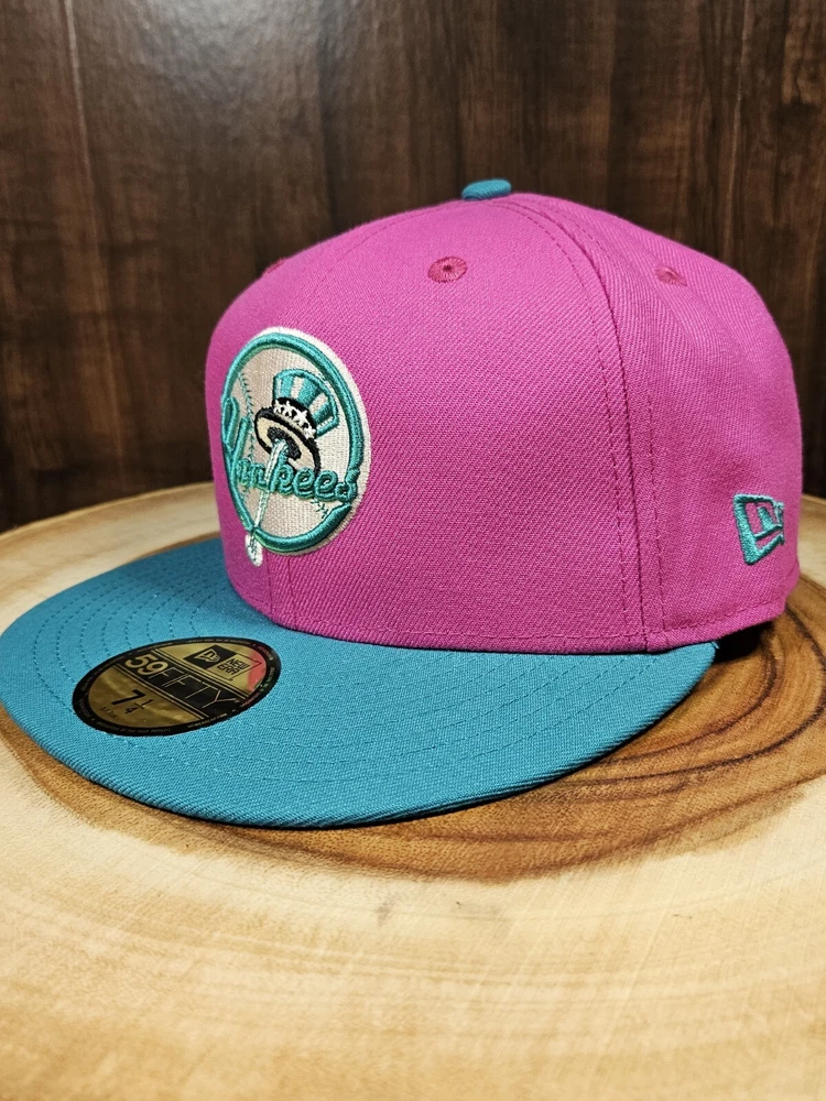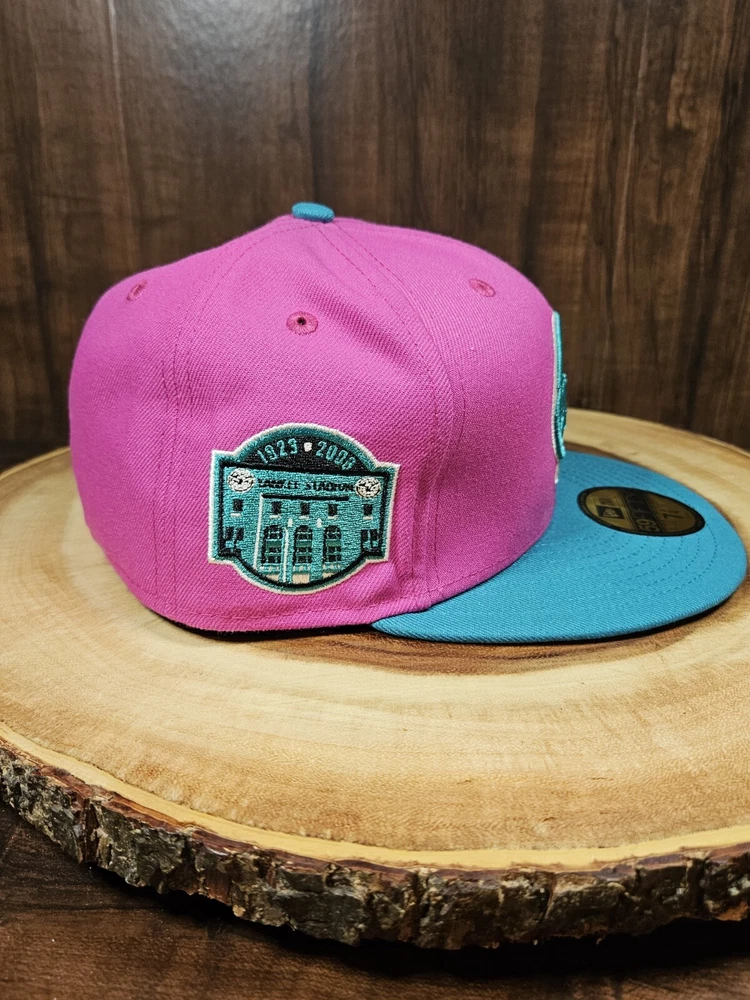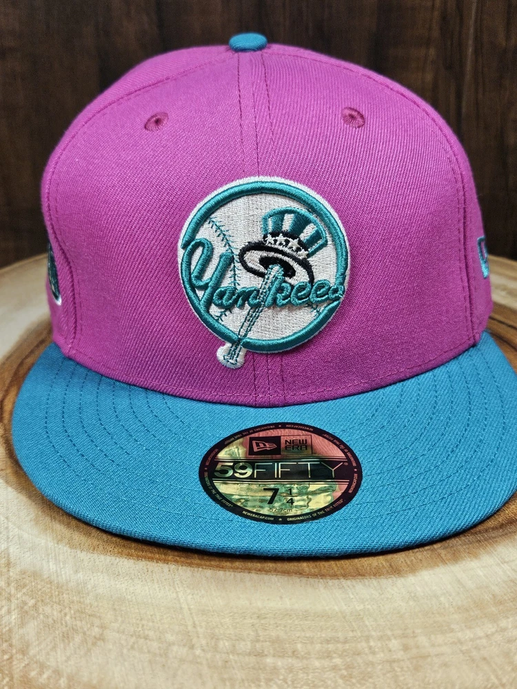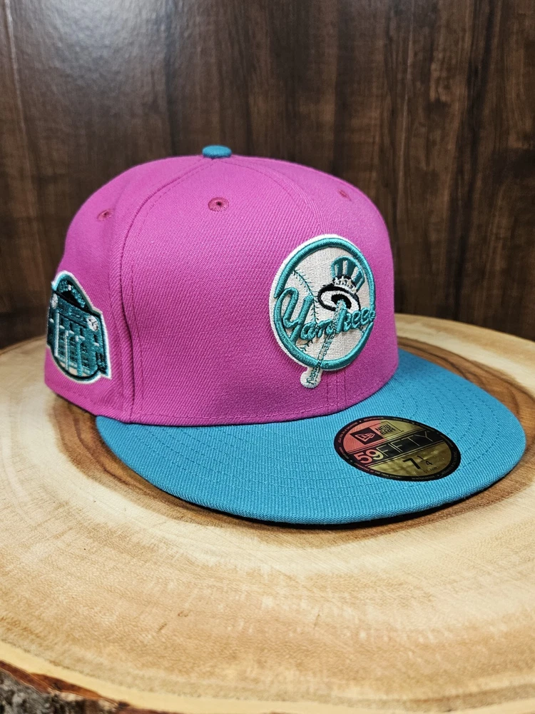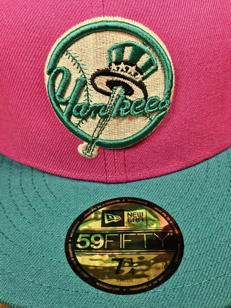 New York Yankees New Era 59Fifty Fitted Hat in a striking pink/aqua colorway commemorates the 80th year of Yankee Stadium. This solid pattern baseball cap is designed for men with a size of 7 1/4 and boasts a fitted style for a comfortable fit. The cap features a patch of the iconic Yankee Stadium, making it a must-have for any MLB baseball fan and a perfect accessory for streetwear enthusiasts. This New Era cap is a great addition to any sports-themed wardrobe and is sure to turn heads. See pictures for better color...lighting a little off