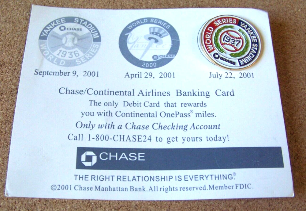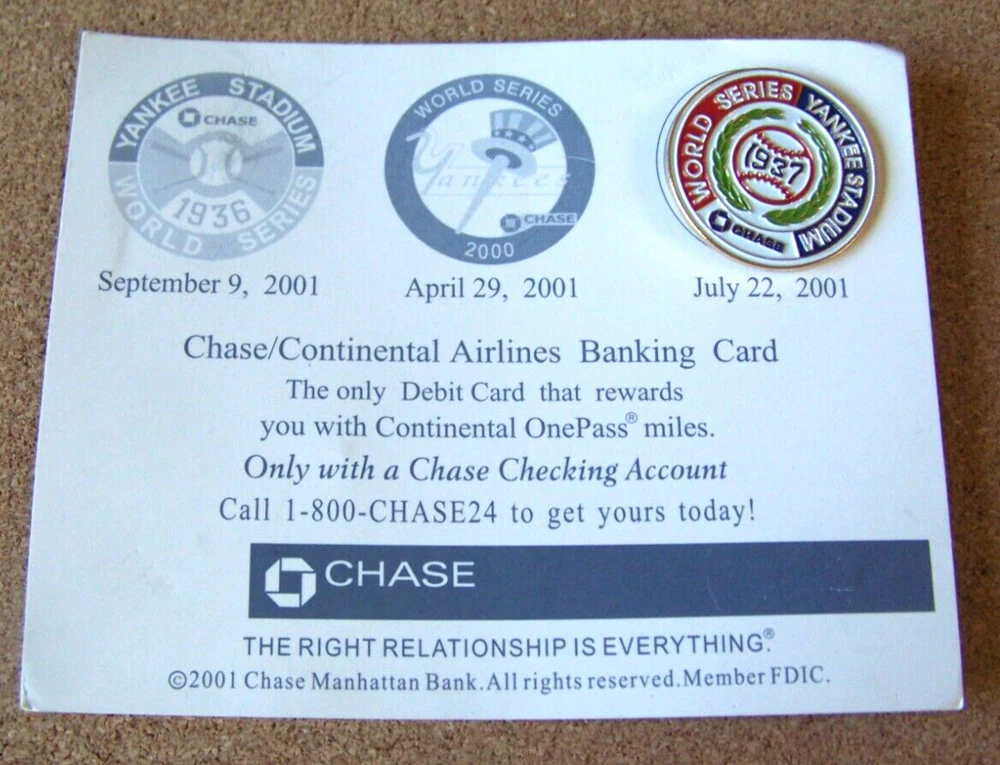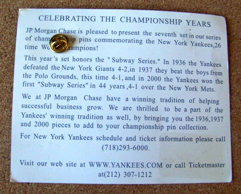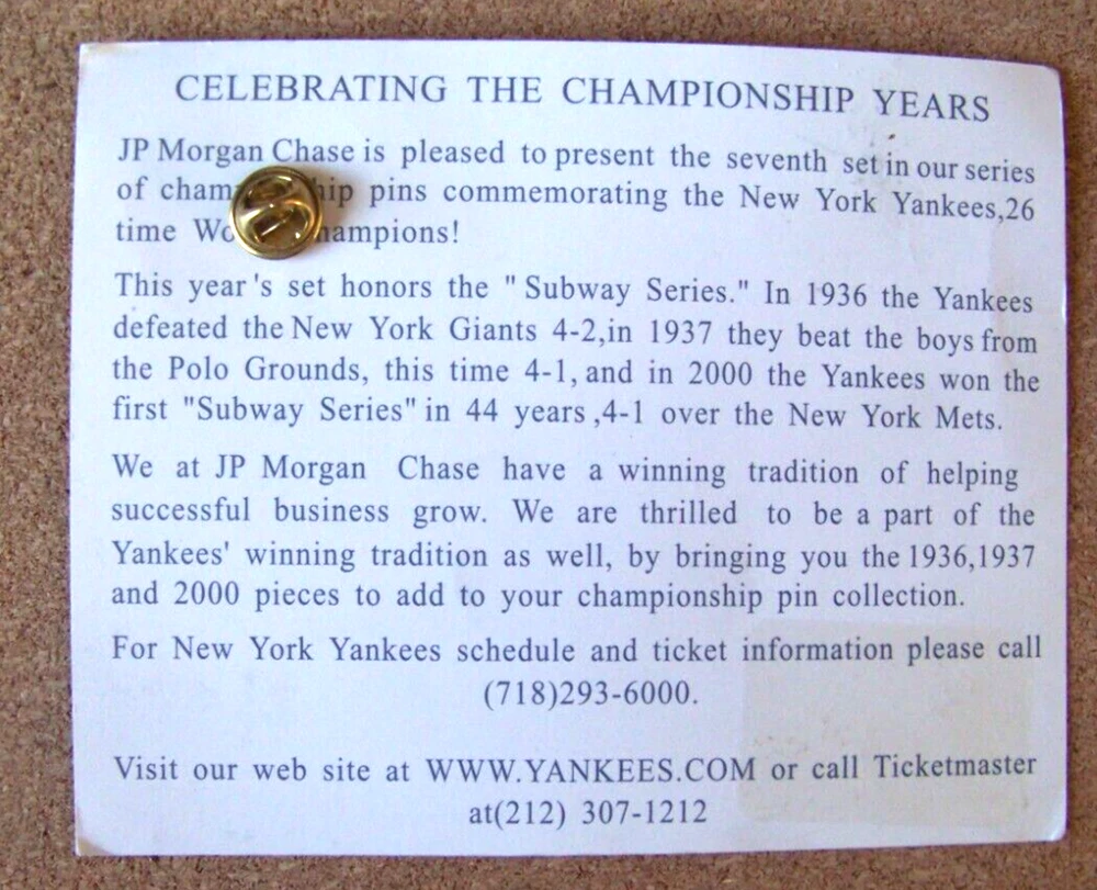 New York Yankees pin 1937 World Series Chase SGA w/ backing card WS NY This MLB licensed post and butterfly clip backed pin measures about 1-1/4" wide and is rim/backed in gold tones. Part of the Chase Bank series, Yankee Stadium give away. No protective packaging, but pin is excellent, no problems. Card has minor bends and minor dings on corners. NYY, N.Y. Major League Baseball Don’t forget to click on my "Stores" link, next to my eBay name, to see other items I currently have listed for sale, or you can copy and paste this address into your browser: stores.ebay.com/highcountrycollectibles SHIPPING INFORMATION Shipping to U.S. addresses is FREE! HIGH COUNTRY COLLECTIBLES Since 1989 – A LEADER IN THE DENVER SPORTS MEMORABILIA MARKET. Check out my other auctions and listings, and keep an eye out for the different, unusual, and EXCLUSIVE items available nowhere else but from High Country Collectibles.