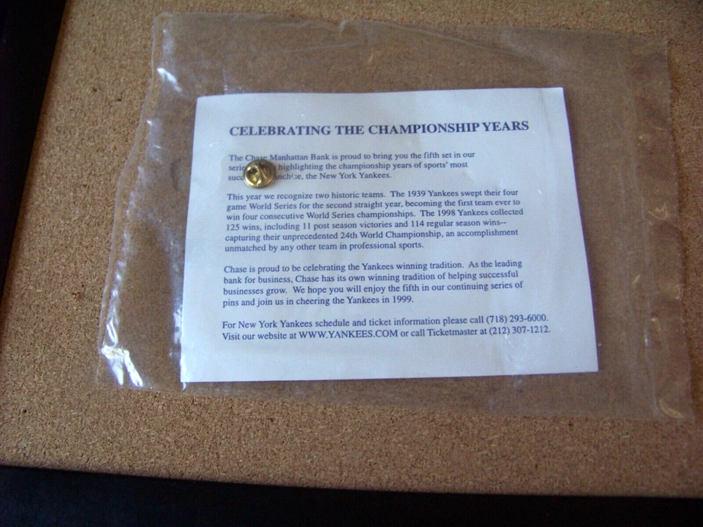 New York Yankees pin 1998 World Series Chase SGA, sealed backing card WS NY This MLB licensed post and butterfly clip backed pin measures about 1-1/4" wide and is rim/backed in gold tones. Part of the Chase Bank series, Yankee Stadium give away. Sealed original protective packaging. Card has minor bends and minor dings on corners. NYY, N.Y. Major League Baseball Don’t forget to click on my "Stores" link, next to my eBay name, to see other items I currently have listed for sale, or you can copy and paste this address into your browser: stores.ebay.com/highcountrycollectibles SHIPPING INFORMATION Shipping to U.S. addresses is FREE! HIGH COUNTRY COLLECTIBLES Since 1989 – A LEADER IN THE DENVER SPORTS MEMORABILIA MARKET. Check out my other auctions and listings, and keep an eye out for the different, unusual, and EXCLUSIVE items available nowhere else but from High Country Collectibles.