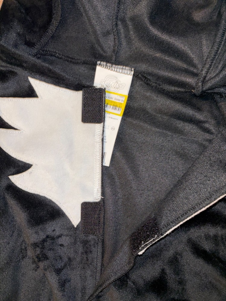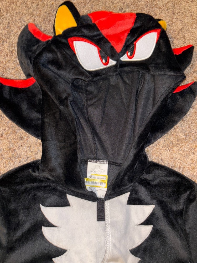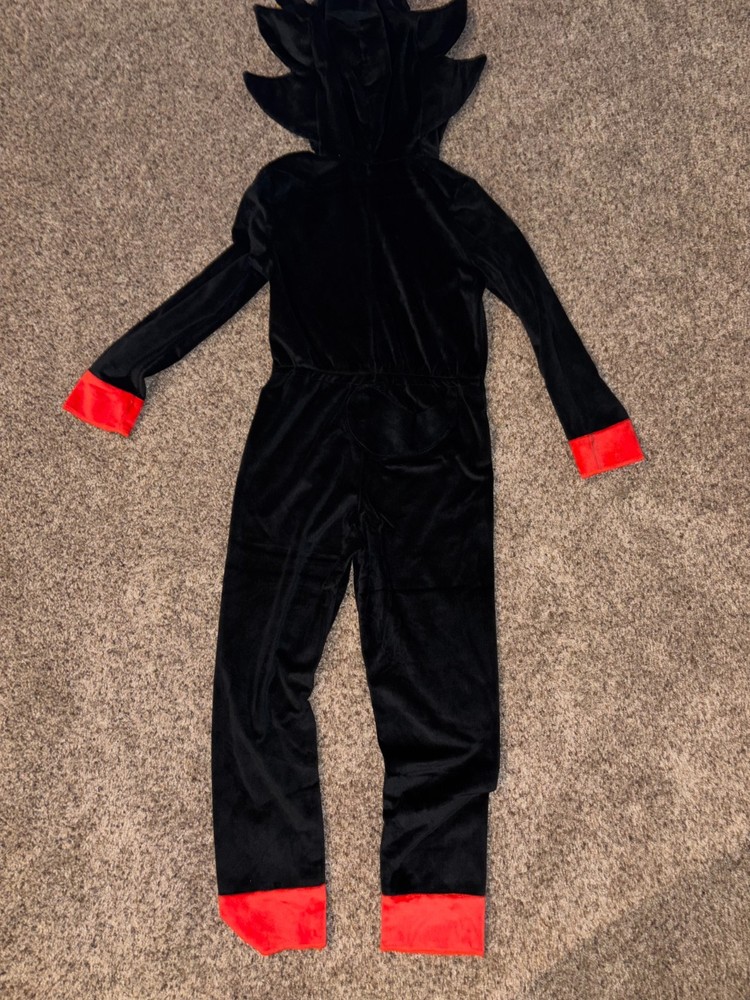 New (no tags): Shadow the Hedgehog, boys' soft velour character pajamas. Black and red hooded one piece with velcro front closure. Size Medium (7/8).
