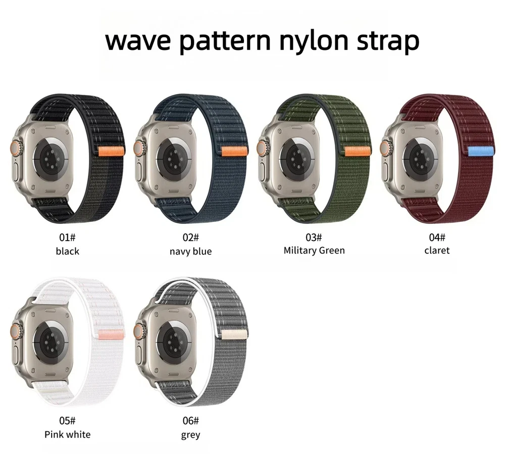 New wave pattern nylon strap for Apple Watch 10 9 8 SE Ultra 2 42/44/45/46/49mm Features: 【 Premium Material 】 Made of tough, durable nylon, this watch strap excels in challenging conditions. Its soft, finely woven texture, combined with enhanced elasticity, ensures remarkable comfort. The skin-facing side is tightly woven, offering a soft cushion and a premium feel. 【 Security & Easy to install 】 Durable Trail Loop Nylon wristbands comes with watch lugs on both ends, which locks onto watch interface precisely and securely. It can effectively prevent your apple watch from falling off and becoming loose. The upgraded linker on both ends locks precisely and securely on. Don't need any tools, easy and direct installation and one button removal. 【 For All Scenes 】 Suitable for many scenes, especially suitable for sports such as hike, run, outdoor Activities. Making the ultimate sports watch for athletes of all kinds required a unique approach. That?s why specialized bands for outdoor adventures, endurance training, and water sports are as meticulously crafted as the watch itself. 【 For Wrist Size 】 Suitable for 130-220mm (5.12"-8.66") wrists. Compatible With: > For Apple Watch Ultra / Ultra 2 > For Apple Watch Series 10 / Series 9 / Series 8 / Series 7 / Series 6 / Series 5 / Series 4 / Series 3 / Series 2 / Series 1 / > For Apple Watch Nike > For Apple Watch Hermes > For Apple Watch SE Package Includes: 1x wave pattern nylon strap !!! ( PS: The Apple Watch is Not Included )