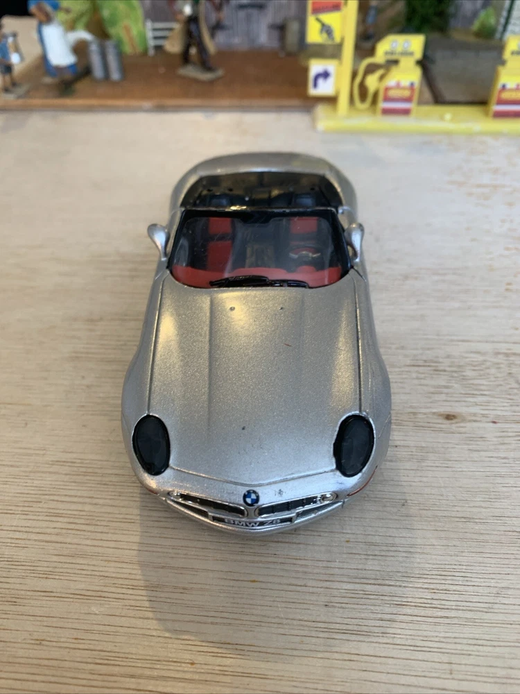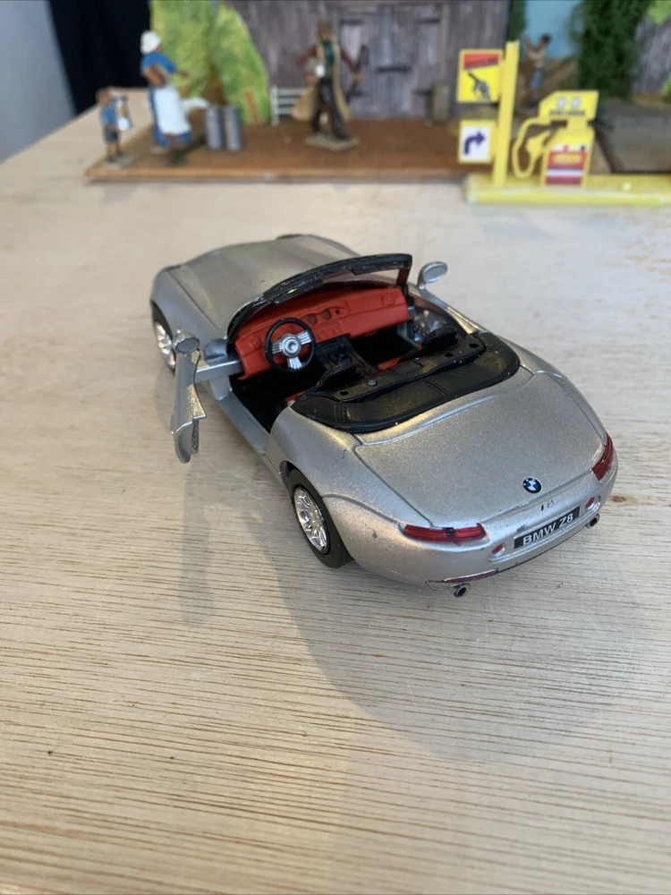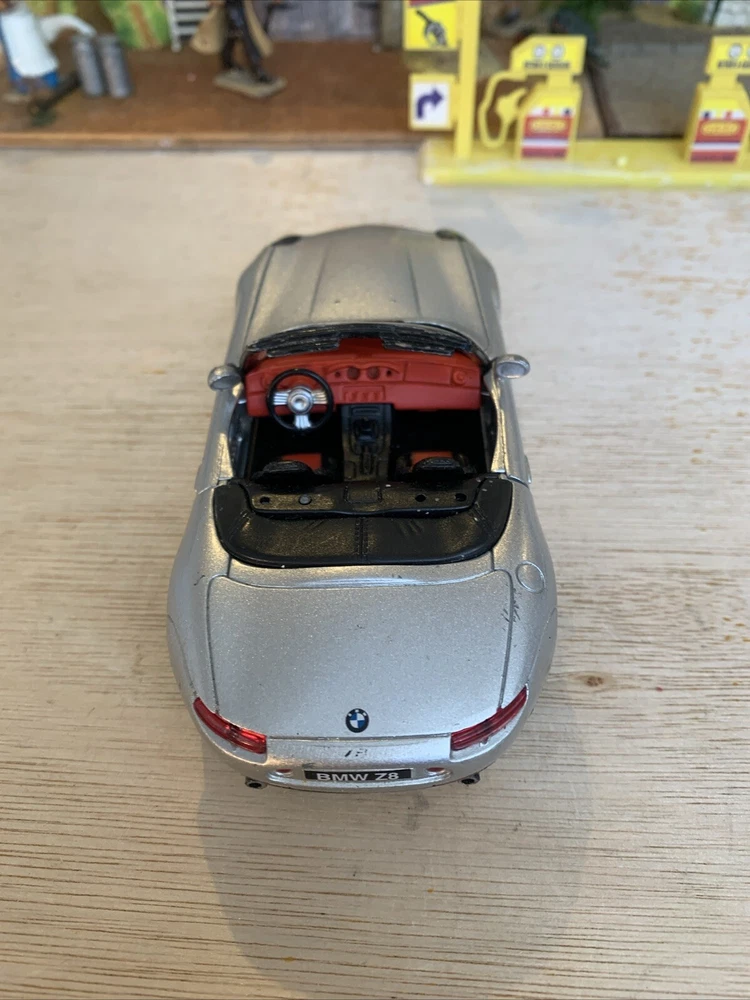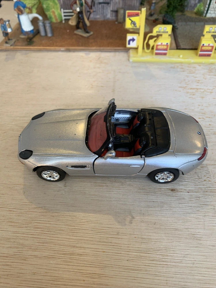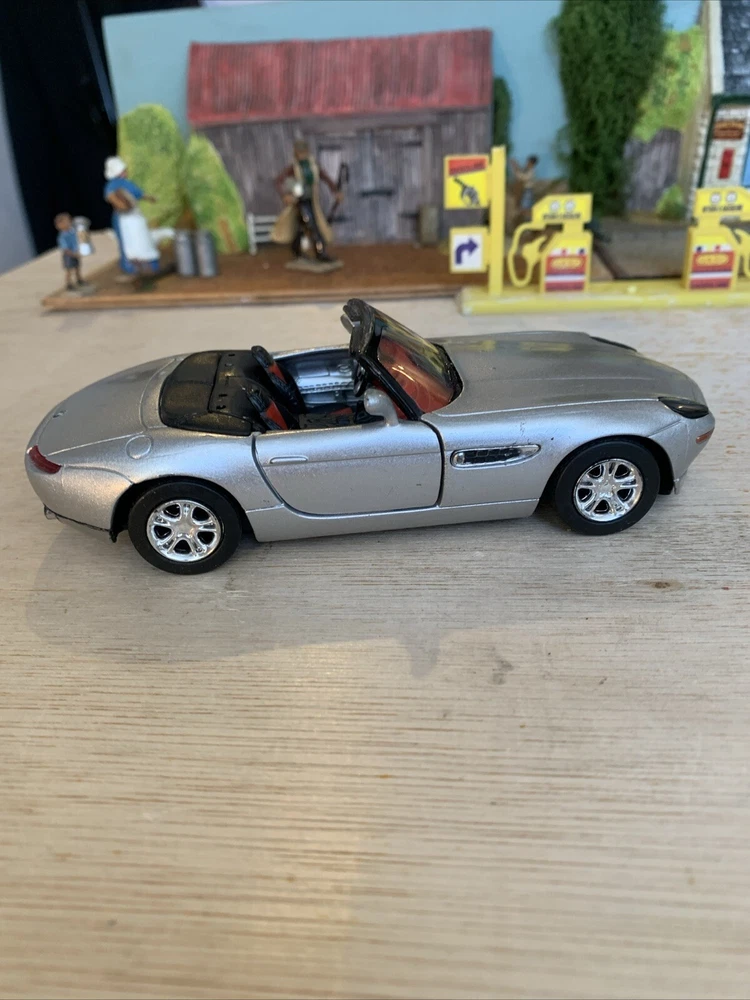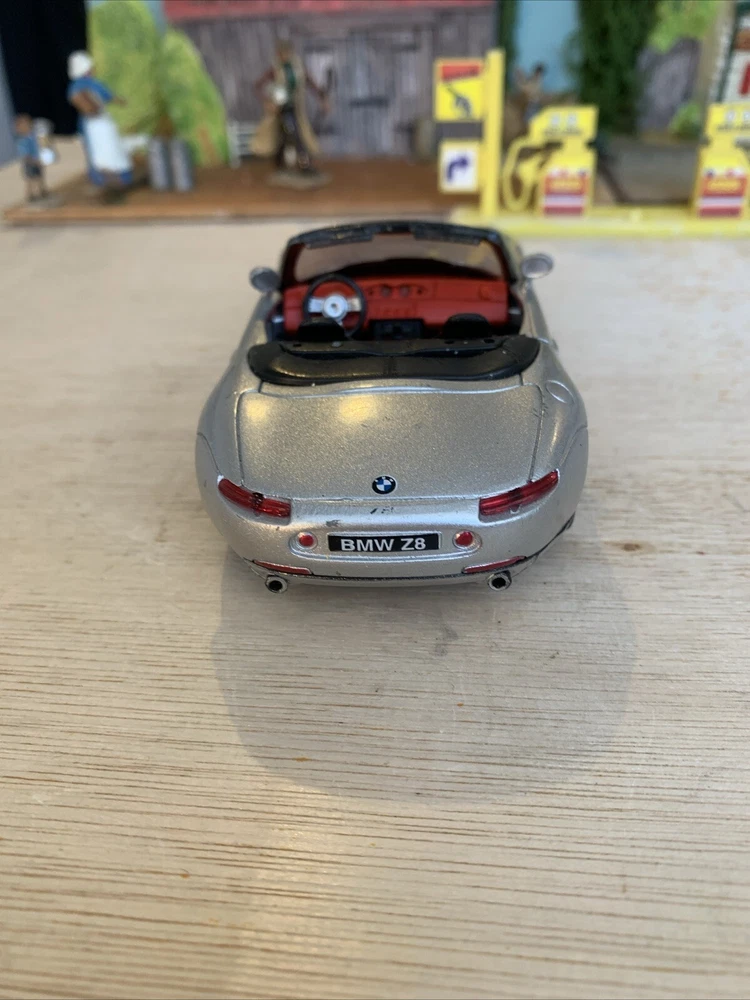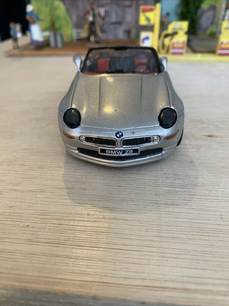 This is a New-Ray diecast model from the City Cruiser Collection of a BMW Z8 car from the year 2000, in a 1:43 scale. The model is in a silver colour and is made from Zamak and plastic materials. It is not customised and was not signed by anyone. Manufactured in China, this collectible toy car accurately represents the design of the BMW Z8 from 2000. Used condition see photos