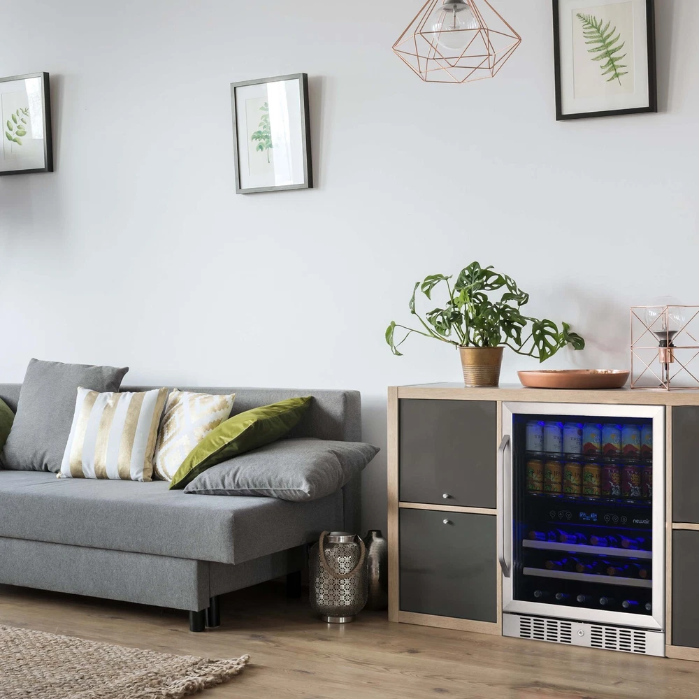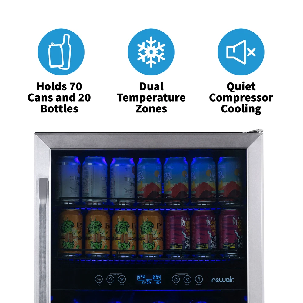 Get ready to party with the Newair AWB-400DB Dual Zone Wine and Beverage Fridge. This handy beverage cooler has two cooling zones so you can keep both wine and beer at the perfect temperature for serving. Easy-slide wine racks and the innovative SplitShelf™ configuration help maximize storage space so your well never runs dry while you're entertaining. 1. One Complete Package for Chilling All Your Drinks: With two temperature zones in one handy fridge, you can keep up to 20 wine bottles on the bottom and up to 70 standard beer or soda cans on the top. Use the digital temperature control to keep your wine and carbonated drinks at the ideal temperature for serving. 2. Maximize Space With SplitShelf™ Configuration: The AWB-400DB features clever SplitShelf™ configuration that allows you to double the number of cans you store. The half-depth shelves let you stack cans with different footprints on top of each other. Prefer bottles? Place them in front of a half shelf so they can stand upright. With SplitShelf™, you've got options. 3. A Compact Wine Cellar for Your Favorite Bottles: Keep your wine collection at the perfect temperature for short-term storage or long-term aging in dedicated wine racks. Smooth gliding shelves minimize vibration to keep sediment from churning while allowing you to easily read the labels as you choose your vintage. 4. Fits in Nearly Any Room Where You Want to Serve Drinks: The front-venting compressor system allows you to slide this beverage refrigerator in under any standard-height counter for a sleek, built-in look for your kitchen. It’s solid black sides and stainless steel door also look great in stand-alone applications for your home bar, man cave and more. 5. Beautiful, Durable Design Touches: The double-pane glass door keeps cold air inside for maximum efficiency, while the adjustable interior LEDs bathe your drinks in a chic blue light. Durable stainless steel doors resist scratches. There's even a lock and key to keep your adult beverages safe from curious little hands.