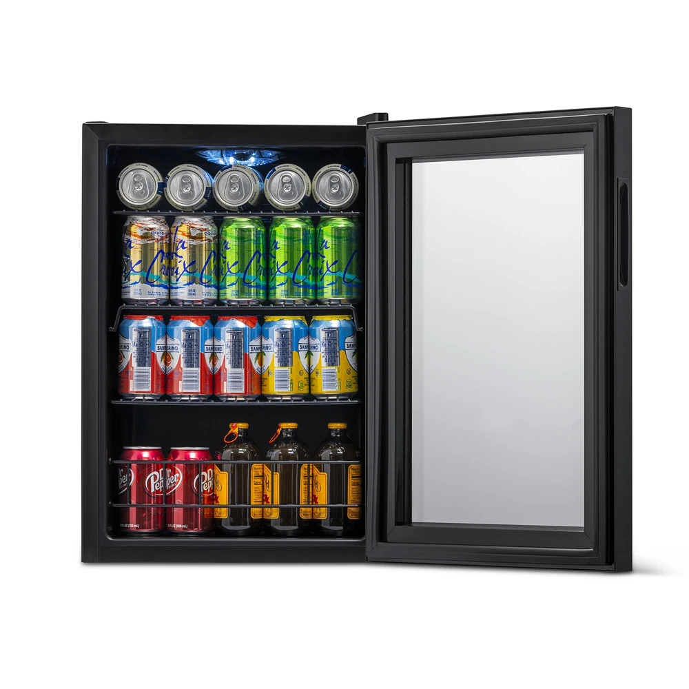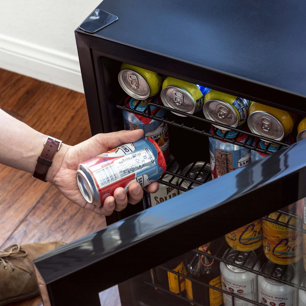 Keep all your favorite beverages perfectly chilled and ready to serve in the Newair 90 Can Compact Beverage Fridge. The freestanding design is ready to use out of the box, and adjustable shelves let you create customized storage for different sized cans and bottles. 1. Powerful and Capable Compressor: The Newair 90 Can Compact Beverage Fridge features a powerful compressor cooling system that keeps your drinks at a consistently chill 37 degrees for optimum refreshment. Choose from 7 custom thermostat settings to keep beer and soda at the perfect temperature for serving. 2. Compact Design Has Room for 90 Standard Cans: At just 16.9 inches wide and 25.4 inches high, this little fridge packs a big punch. With the capacity to hold up to 90 standard cans, you can fit all the drinks you want inside - without having to redesign your kitchen or home bar to make room for a larger appliance. 3. Removable Storage Shelves for Flexibility: The interior shelves of the Newair 90 cans freestanding beverage cooler can be adjusted to make room for oversized bottles and containers of all shapes and sizes so you can keep all your drinks in one place. The interior LED light is also adjustable. 4. The Use-it-Anywhere Beverage Fridge: The Newair 90 Can Compact Beverage Fridge doesn't require special installation or new cabinets to get started - just plug it in and you're ready to go. Its sleek black finish and LED interior light guarantee that it looks great anywhere. 5. Double-Paned Doors Keep It Cold: Double-paned glass doors provide outstanding insulation to keep all that cold air inside. They also provide on-trend good looks and an easy way to find exactly the right beverage when company calls. 6. Keep Drinks Away from Curious Kids: Whether you have toddlers or teens, not every drink is appropriate for every member of the household. The Newair 90 Can Compact Beverage Fridge in Black comes equipped with an integrated lock and key to keep adult beverages safely out of curious hands. It's the perfect beverage fridge for families who have safety in mind.