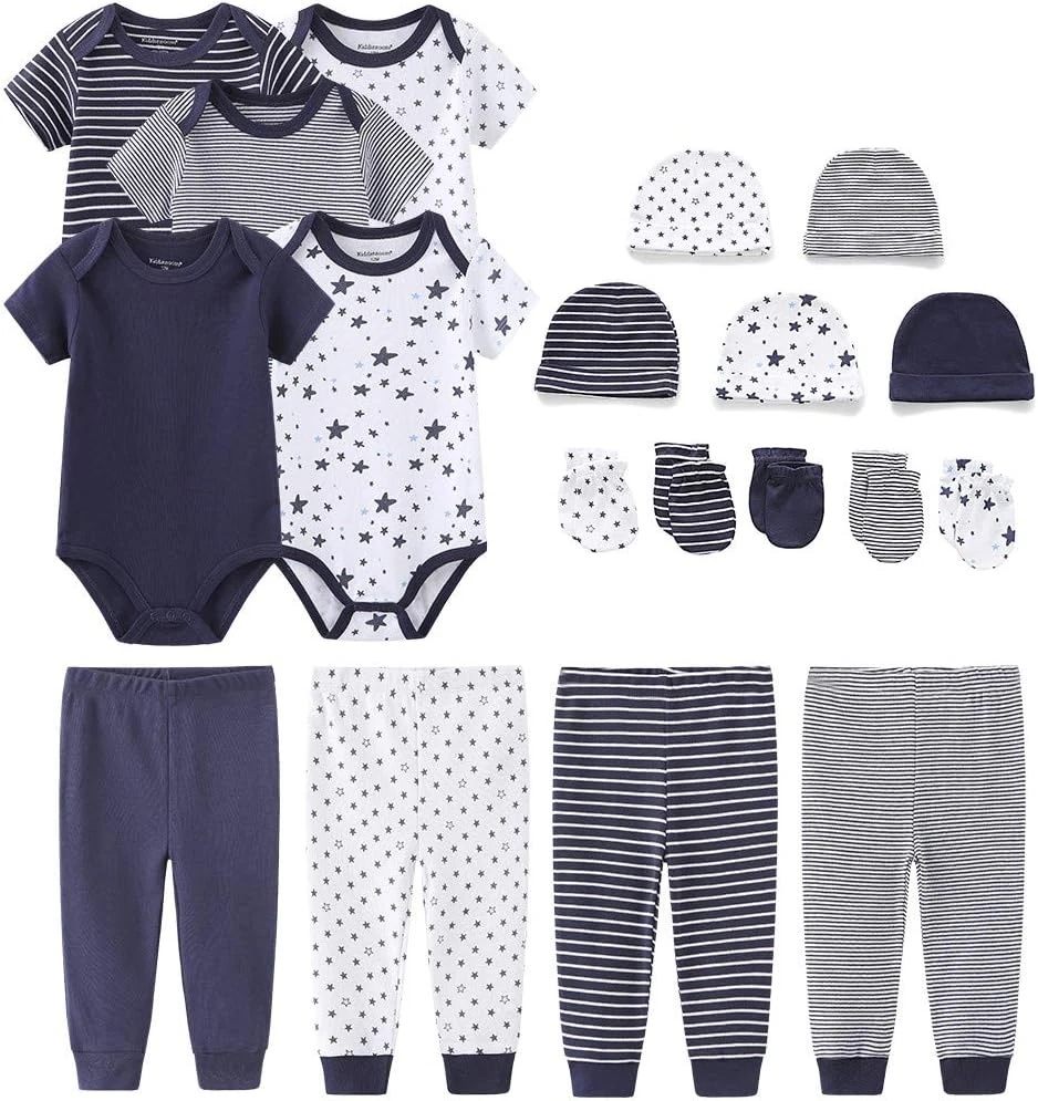 Product description Kiddiezoom Newborn Baby Layette Set Soft, comfortable, and made with 100% cotton to protect your little one's delicate skin, this newborn layette set is the perfect choice for your baby's first outfits. Delicate and elastic Improvement of textile technology Soft, warm, breathable, and skin friendly Kiddiezoom Newborn Baby Girl Boy Clothes Baby Outfits Pants Bodysuits Gifts Set Layette Set 0-3 Months There are different designs for baby boys, baby girls, and unisex baby The top comes in both short sleeved and sleeveless designs The size range is 0-3 months The specific size selection depends on the actual situation, referring to the length, width, and height details in the size chart It can be paired with the same pattern as a set of clothes, or mixed and matched into many sets Only the pattern is different, the fabric and size are the same Light and lively parent-child life The wiring is more delicate and skin friendly, and the collar is expandable on both sides, making it easy to put on and take off, suitable for novice mothers to put on and take off clothes for their babies Careful routing Adding relaxing design elements to make parent-child life full of vitality and color Cute collar design Rich detail design adds fun and personality,Multiple colors also provide babies and mothers with new visual experiences every day Multiple themes to choose from Satisfy the design preferences of different people Cute style Classic size design for easy selection Accessories are of high quality Small details reflect uniqueness Cotton material Consider the usage experience of the baby and mother Some upper body pictures of clothes from the same brand