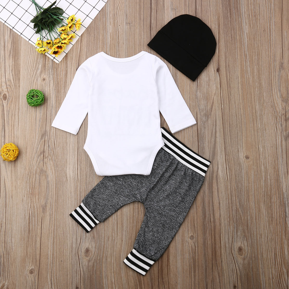 Features: Condition: 100% Brand New Material: Cotton Blend Style:Casual Pattern Type:Letter Collar Type:Round Neck Sleeve Length:Long Sleeve Sleeve Type: Regular Occasion: Casual, Everyday, Party Size chart: Recommend Age Top Length CM Top Length Inch Bust CM Bust Inch Pants Length CM Pants Length Inch 0-3 Months 37 14.54 46 18.06 36 14.15 3-6 Months 39 15.33 48 18.86 38 14.93 6-12 Months 41 16.11 50 19.66 40 15.72 12-18 Months 43 16.90 52 20.44 42 16.51 Package Content: 1 x Jumpsuit 1 x Pants 1 x Hat NOTE: 1.Please compare the detail sizes with yours before you buy!!! 2.Colors may be slightly different depending on computer and monitor settings 3.Please allow 1-3cm differs due to manual measurement, thanks (All measurement in cm and please note 1cm=0.39inch) Thanks for your understanding.