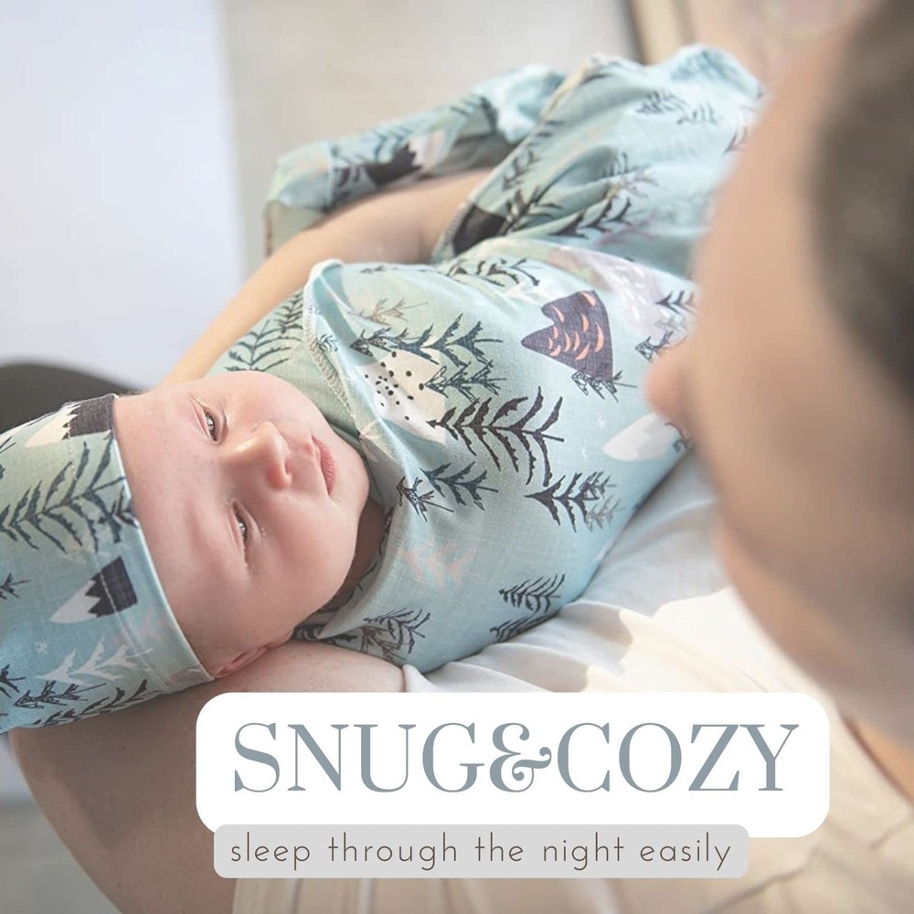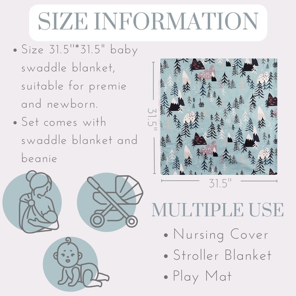 This super soft and stretchy swaddle blanket is perfect for wrapping up your newborn, using as a toddler blanket, or just becoming a lovely chic newborn photo material on the social media. Feature -Lightweight, breathable, and extra buttery soft for your babies delicate skin -Perfect for calming the fussies and getting your baby to fall fast asleep -Perfect for photo shooting, newborn swaddling, car seat or stroller blanket -Play as an essential role in newborn age while its natural weave makes it stretchy enough for a nice, snug fit, yet is comfortable for all day wear. Specification Size: 31.5 inch X 31.5 inch (80cm X 80 cm, please allow 1-2 difference) Washing instruction We recommend washing the product before the first use, to loosen the fabric and bring out its peak of softness. *No bleaching. *Hang to dry. *Hand wash instead of dry cleaning recommended. Notification As different computers display colors differently, the color of the actual item may vary slightly from the above images, please kindly understand about that. Package Included 1* Receiving Blanket 1* Matching Beanie Made of a breathable, lightweight, stretchy knit in mountain print. Suitable for 0-3 month newborn baby for calming the fussies and getting your baby to fall fast asleep. This swaddle blanket measures approximately 31.5" x 31.5" (80cm X 80 cm, please allow 1-2 different)and is professionally serged around rounded edges for maximum durability. Natural weave makes swaddling a breeze, stretchy enough for a nice nap with enough wiggle room. Our buttery soft swaddle has the perfect amount of stretch for swaddling in the newborn stage and versatile use as stroller blankets, nursing cover, receiving blankets and more.