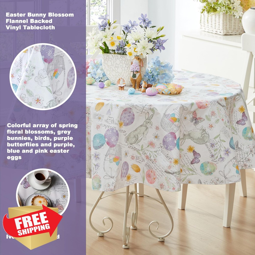 Newbridge Spring Easter Bunny Blossom Vinyl Tablecloth 70 Inch Round Features Vinyl Flannel Back Easy Care Wipe Clean Tablecloth Imported Newbridge Bunny Blossom Flannel Backed Vinyl Tablecloth, Egg Basket Floral Vinyl Tablecloth With Flannel Backing, 70 In Round Seats 4 to 6 People STYLING: The Newbridge Bunny Blossom Flannel Backed Vinyl Tablecloth features an eclectic colorful array of spring floral blossoms, bunnies, birds, butterflies, eggs on a an ivory background with printed vintage postcard postage and sayings. FEATURES: Beautiful Easy Care Vinyl Tablecloth for Easter, Spring, Summer, Memorial Day, Mothers Day, Fathers Day, July 4th , Labor Day and Year Round Dining, Entertaining, Parties, Barbecues, Picnics, Restaurants and Cafeterias. Indoor and Outdoor Flannel Back Tablecloths are Easy Care - Just Wipe Clean - No Laundering Needed CARE INSTRUCTIONS: Vinyl Flannel Backed Tablecloth - For best results use mild soap with damp cloth or sponge on vinyl surface of tablecloth. Do not Iron or machine wash or dry. Materials: Surface 100% Vinyl, Flannel Backing: 100% Polyester Shipping Free & Fast Shipping: We offer free shipping to most of the USA with a normal delivery time of 3-7 days. However, due to the current situation, additional delivery time (up to 3 weeks) may be required for some items. Alternative Carriers: We may use alternative carriers (e.g., USPS, FedEx, UPS) to ensure your package arrives safely and on time. Due to the use of multiple carriers, we are unable to provide a tracking number automatically. Handling Time: Orders are processed and shipped within 1-2 business days of receiving cleared payment. Shipping Restrictions: Shipping to Alaska, Hawaii, Puerto Rico, Guam, and other US territories may incur shipping charges or delivery restrictions. Please contact us before ordering, or your order can be refunded/cancelled. State Restrictions: Certain items may not be shipped to California due to state regulations. Contact for Tracking Updates: If you require tracking updates or have any concerns about the delivery of your order, please feel free to contact us, and we will be happy to assist you. Return Policy 30-Day Hassle-Free Returns: If you are not completely satisfied with your purchase, you can return the item for free within 30 days of receiving it for a full refund or exchange. Easy Return Process: Contact us, and we will provide you with a prepaid return shipping label and detailed instructions. No Restocking Fee: There are no restocking fees for returns. However, the buyer is responsible for return shipping costs if the return is not due to a seller"s error. Refund Processing: Refunds will be processed within 1 business day of receiving the returned item in its original condition. Feedback Your feedback is extremely important to us. We strive to provide the best products and customer service possible. If you are satisfied with your purchase, please take a moment to leave us a positive review. If you have any concerns or issues with your order, please contact us before leaving negative feedback. We are committed to resolving any problems and ensuring your satisfaction. Contact Us If you have any questions or concerns, please feel free to reach out to our customer support team. You can contact us through the eBay messaging system. We are available Monday to Friday, 9:00 am to 5:00 pm EST, and we will do our best to respond to your inquiry within 24 hours. Thank you for supporting our small family business! ]]>