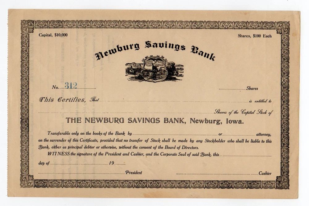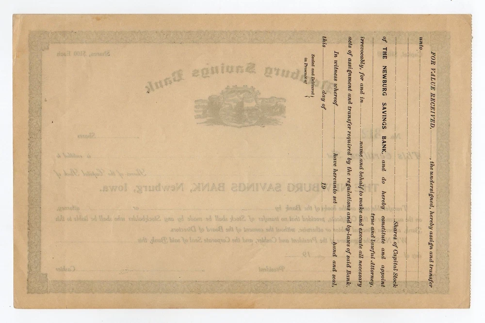 Newburg Savings Bank Stock Certificate Newburg Savings Bank Stock Certificate k290 19-- Newburg, Iowa Newburg Savings Bank Stock Certificate. Unissued. Please look at photo's for condition. Free shipping on this item in the US. Click the vault below to visit my eBay STORE, with lots of BUY IT NOW items!