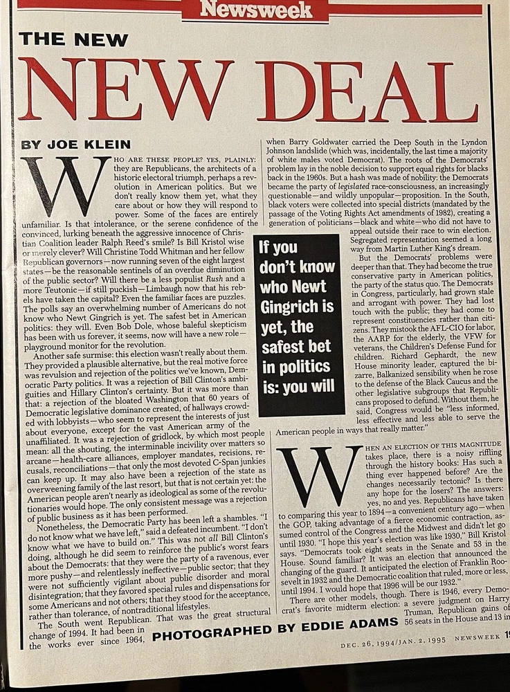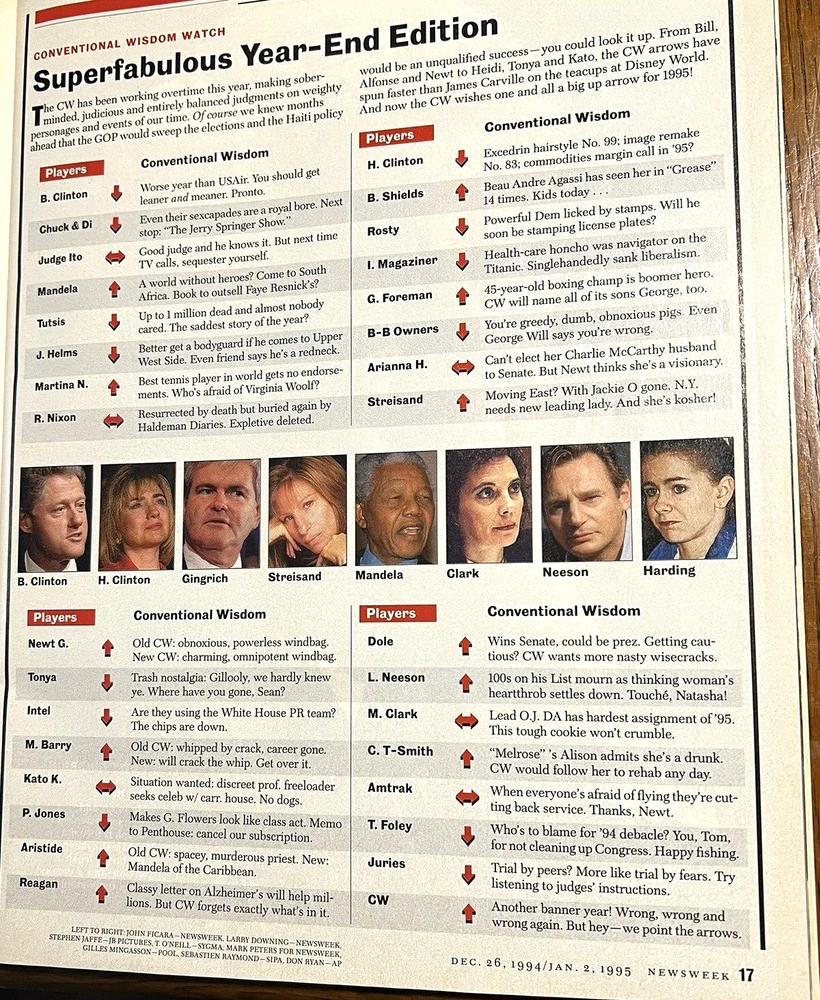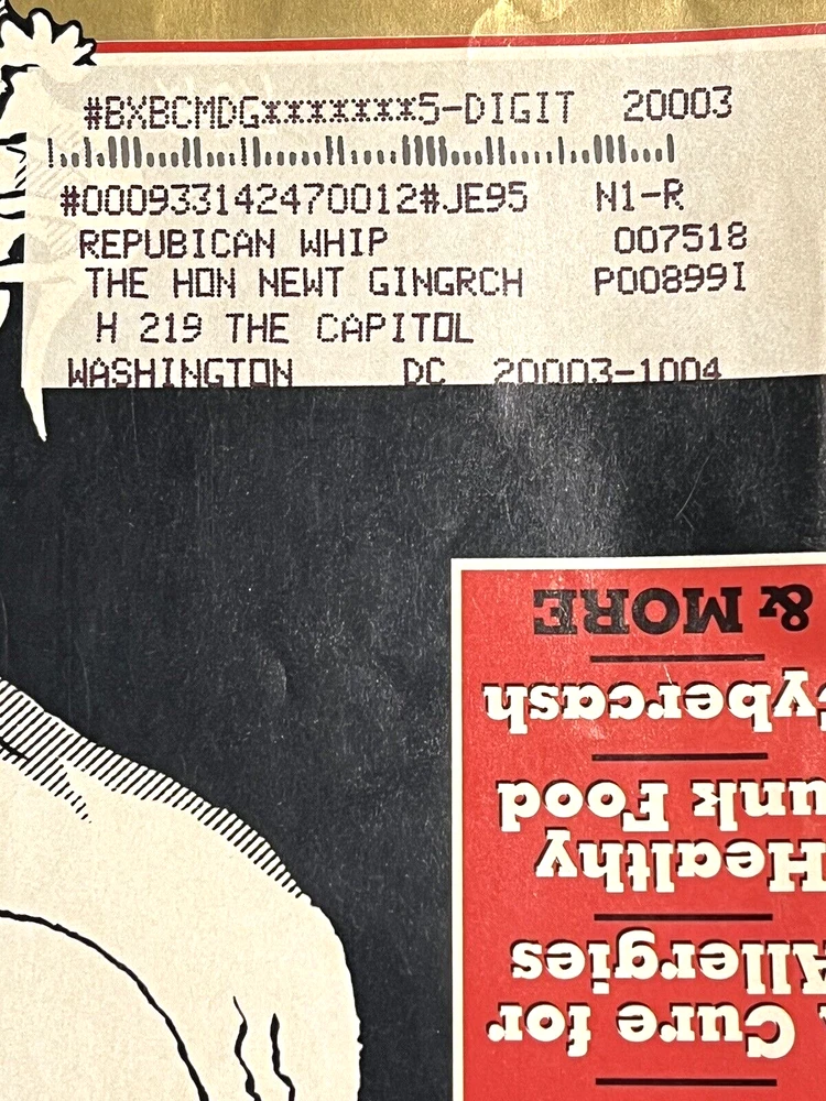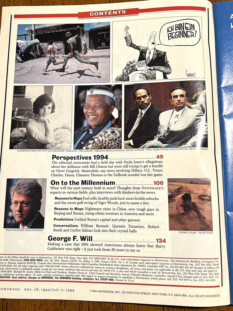 Special Double Issue, Newsweek 1994 in Perspectives , features Bosnia, Jackie O. and Nixon dying, O.J. Simpson and other stories, complete will illustrations. Also, the intriguing narrative of how one of the most iconic political figures of the 90s, Newt Gingrich, allegedly attempted to "steal Christmas" with this unique edition of Newsweek from December 1994. Complete This issue is a must-have for political history enthusiasts and collectors alike. In addition to the main feature, this edition also includes an original mail label with Gingrich's name, adding an extra layer of authenticity and collectibility. The publication spans across December and January, providing a comprehensive look at this intriguing period in political and cultural history.