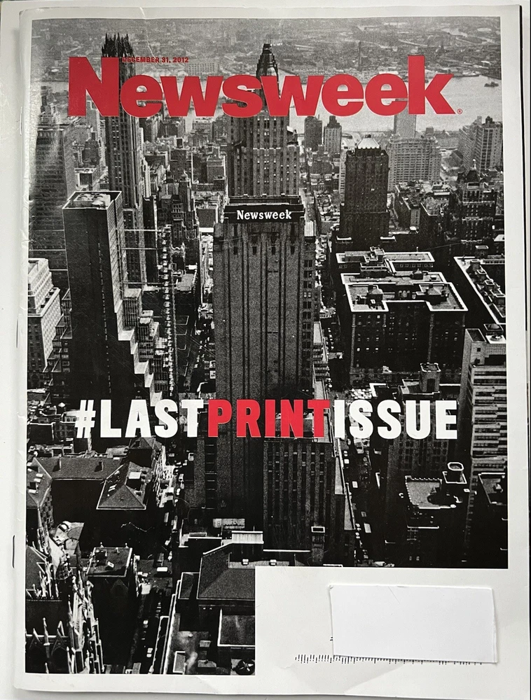 One pre owned, Newsweek Magazine - December 31, 2012. #TheLastPrintIssue - The Last Print Issue! After 80 years, Newsweek looks back at the trials and triumphs… This was a paid mailed subscription, it shows little use…a small rip on cover seam. Please examine photos! Happy Bidding