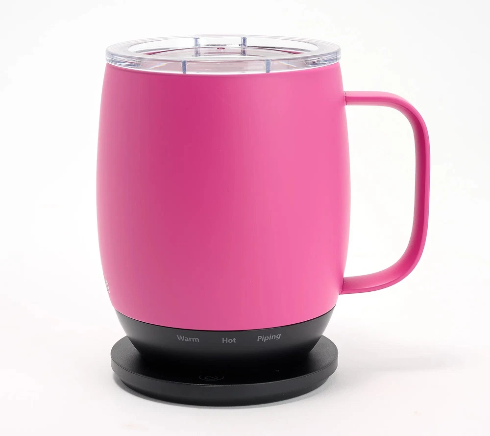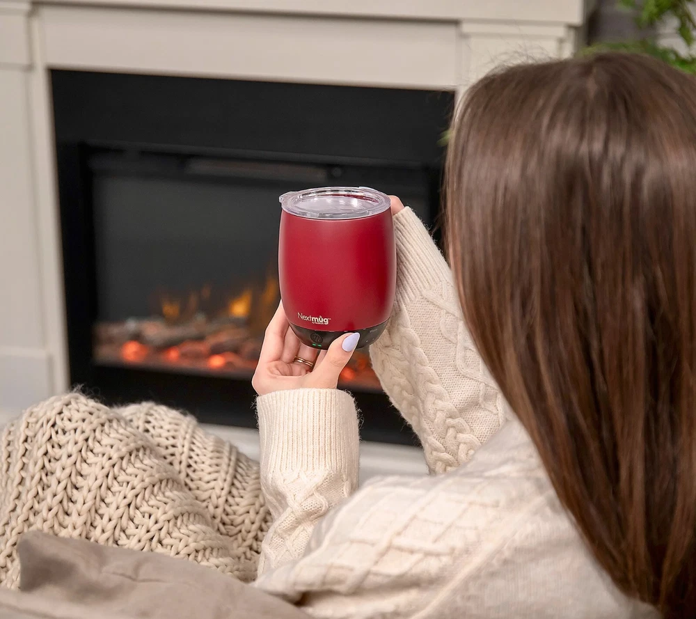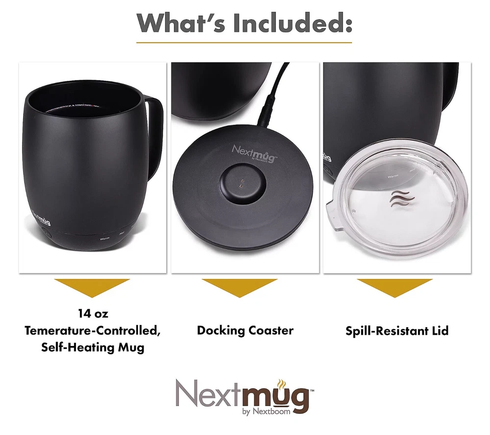 Keep your next cuppa at the perfect temp with this self-heating mug. Whatever your sip of choice, with the NextMug, you just set your preferred temperature and your beverage will stay piping hot/warm sip after sip (ideal for keeping those venti's hot till the last drop). It only takes seconds for a morning's worth of satisfaction. From NextMug. Includes 14-oz NextMug with lid, docking coaster, and charging cord On/off and temperature control buttons Auto off Keeps beverages piping hot (145F) up to three hours; lid on, cup off charging coaster Keeps beverages hot (135F) up to four hours; lid on, cup off charging coaster Keeps beverages warm (125F) up to 4.5 hours; lid on, cup off charging coaster Keeps beverages piping hot (145F) up to one hour; lid off, cup off charging coaster Keeps beverages hot (135F) up to 1.5 hours; lid off, cup off charging coaster Keeps beverages warm (125F) up to two hours; lid off, cup off charging coaster Rechargeable lithium-ion battery Approximate measurements: Mug 4" x 4.5" x 5"; Docking station 3.5" x 5"
