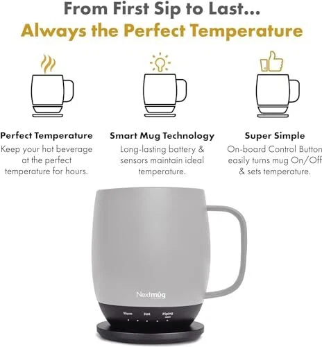 30 Days Return Policy Fast Delivery Trusted seller Nextmug - Temperature-Controlled, Self-Heating Coffee Mug (Almond 14 oz.) Product Description ALWAYS THE PERFECT TEMPERATURE – The Nextmug will keep your hot coffee, tea or preferred beverage at the perfect temperature wver you are. Simply select Warm (130°), Hot (140°), or Piping (150°) and enjoy for hours. SMART MUG TECHNOLOGY – Long-lasting battery maintains your ideal temperature. LED lights display battery life & real-time temperature. Includes Spill-Resistant Lid & Charging Coaster. SUPER SIMPLE – On-board Control Button easily turns mug On/Off & sets the temperature. Takes only seconds to set the mug to your perfect temperature. No app required - no passwords, re-booting or security concerns. EXPERTLY CRAFTED - Elegant ceramic matte finish covers the durable, stainless-steel body of the mug. The patented, ergonomically designed body and handle fits perfectly in your hands. Ideal for home, office or home office. THE PERFECT GIFT - Give the gift that is certain to delight. Perfect for everyone on your list…moms, dads, grandparents, teachers, birthdays, graduations and more! INNOVATION FROM THE USA - Nextmug was designed and tested at our offices in Boulder, Colorado by a team with decades of experience making award-winning consumer products. WHAT'S INCLUDED – (1) 14 oz. Nextmug; (2) Docking Coaster & 6-foot cord to charge the lithium-ion battery inside the Nextmug; (3) Spill-Resistant Lid to keep hot liquids in the mug and help maintain the ideal temperature for longer periods of time. All Nextmugs are fully compatible, including mugs, lids, docking coasters and accessories. Shipping Returns Payment Shipping Shipping is FREE to all addresses other than APO/PO boxes in the lower 48 states. All our stock ships from US-based warehouses. Shipped via USPS or UPS (depending on location and package weight) Unless stated otherwise, all orders will ship within 24-72 hours of your payment being processed. Check our feedback to see the great reviews of FAST shipping we offer. Returns As our valued customer, we will do our best to make sure the product you receive arrives to you on time and as expected. If you are not satisfied with your purchase, please contact us within 30 days of receiving your order to process a return. Payment We currently accept payment via eBay managed payments only. Once payment is cleared, we will dispatch your shipment within 1-3 business days. Please refer to the "Shipping" tab for more information regarding shipping speed to your destination.
