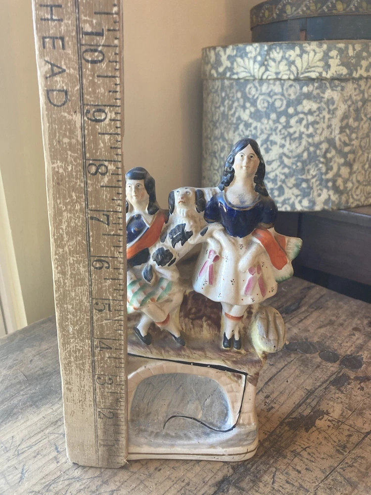 For sale is a nice Antique 19th century victorian era porcelain/ceramic/Staffordshire figurine. It features a boy and the girl with their dog. Below them there seems to be a motif of horse wip. A nice example of early ceramic work. Each figurine measures 8.5” tall, 4.5” wide. It is in good antique condition with a very tight hairline crack. See picture. appropriate surface wears and manufacturer imperfections are to be expected. Please check photos from all angles for details. Overall, it is a nice piece of early Victorian era ceramic artwork that would fit well in any antique collectors home. Ship with careful packaging and full insurance. Feel free to check out my other antique and collectible listings. I gladly combine shipping whenever practical.