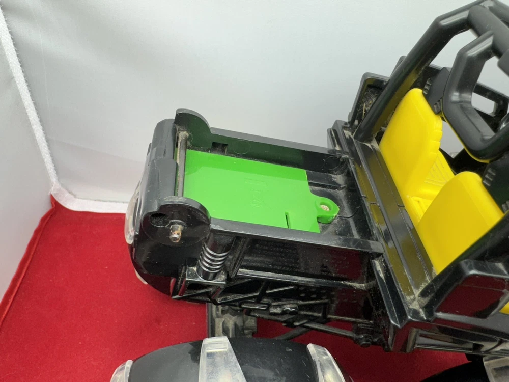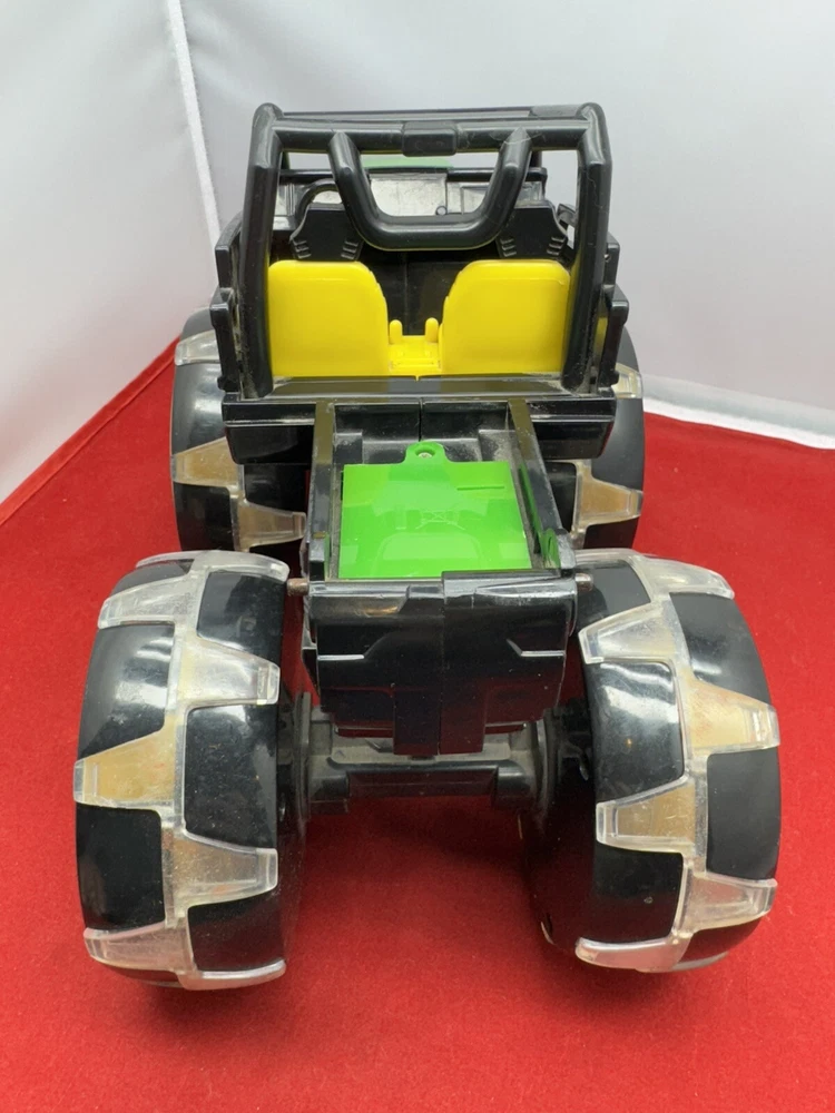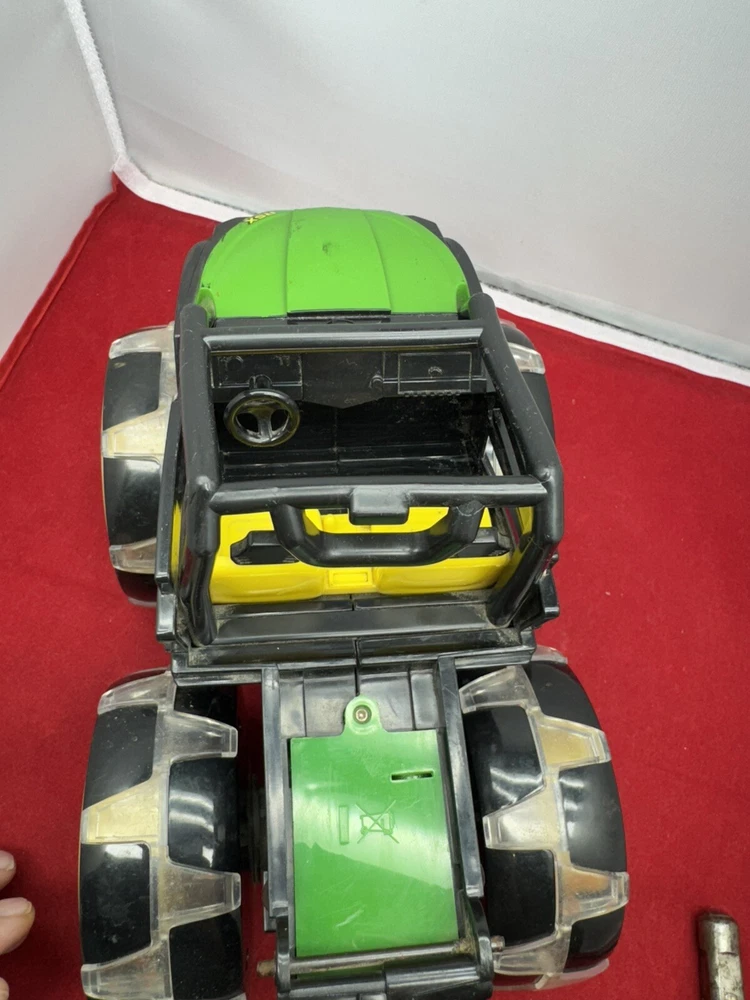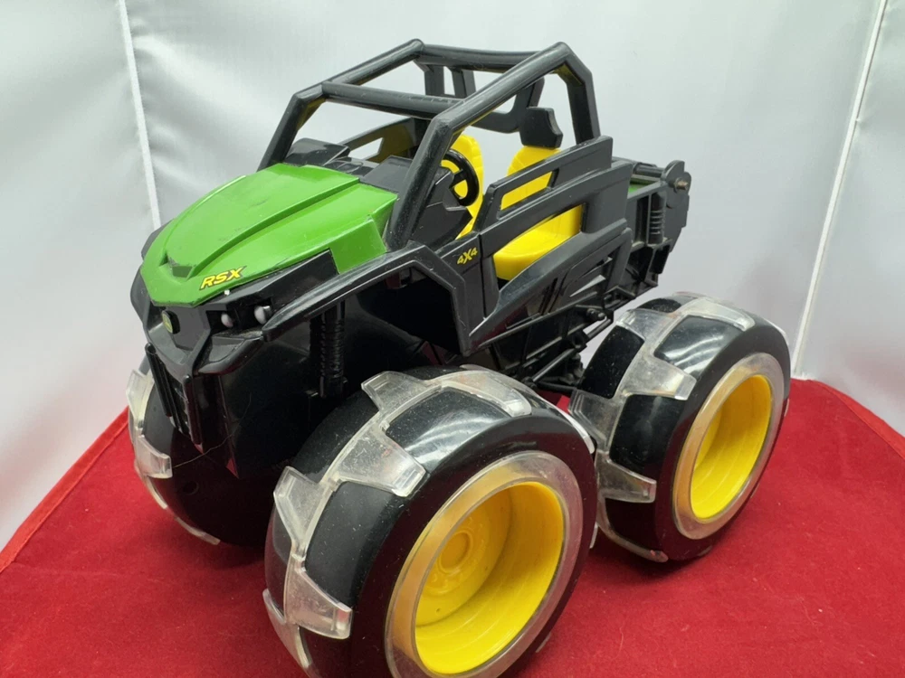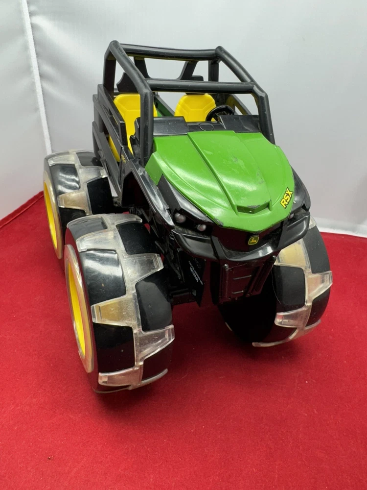 This is a ERTL John Deere Gator RSX 4x4 toy vehicle in green color. It is made of plastic and features lights. The model is part of the John Deere series, and it is a representation of a Gator type vehicle. The toy is from the Cars character family and is missing some parts, which could potentially be replaced or repaired. This collectible diecast toy is ideal for fans of John Deere vehicles and would make a great addition to any toy vehicle collection. Missing parts