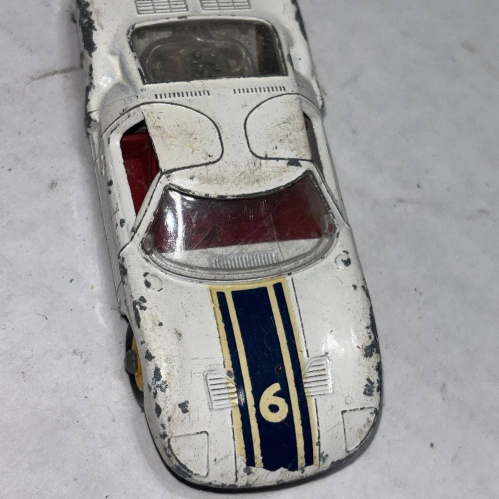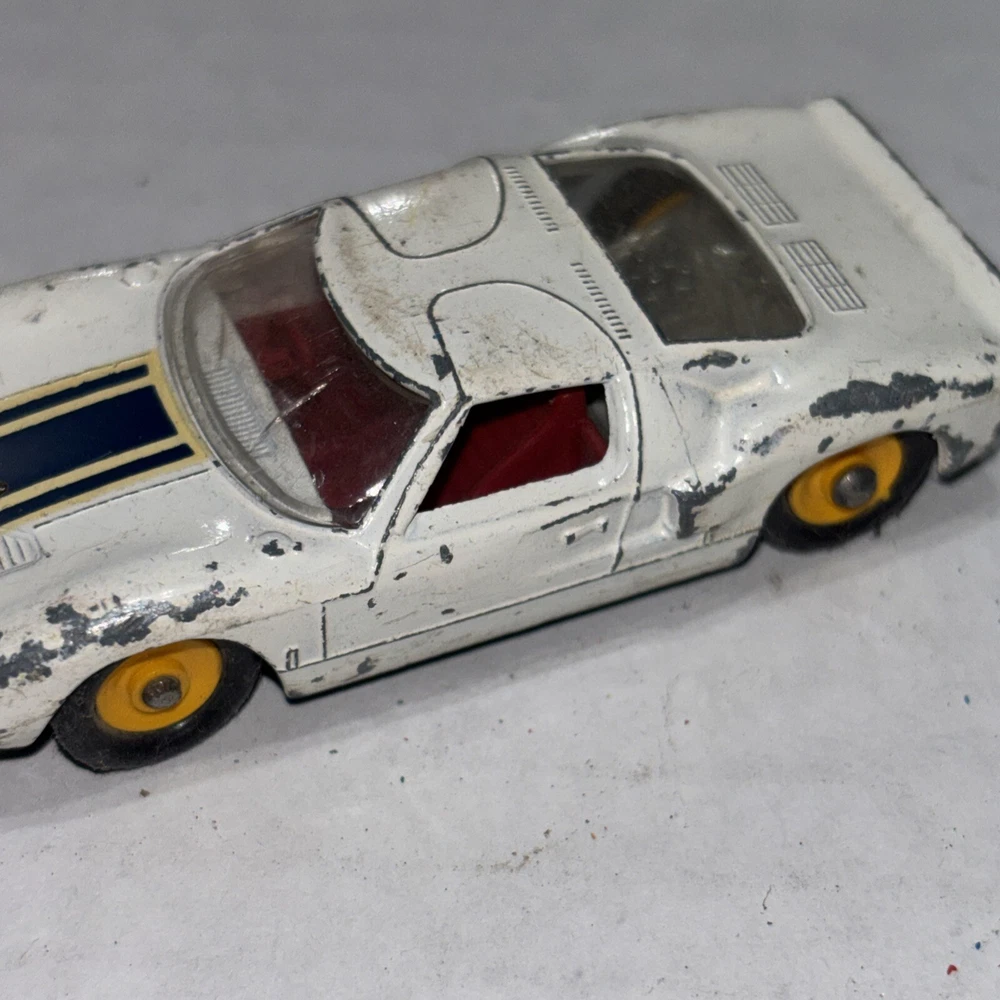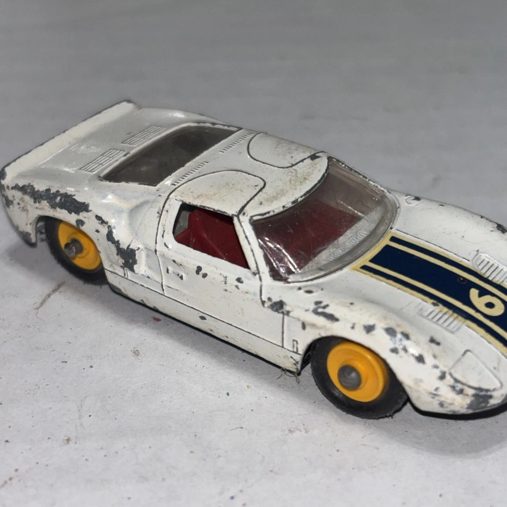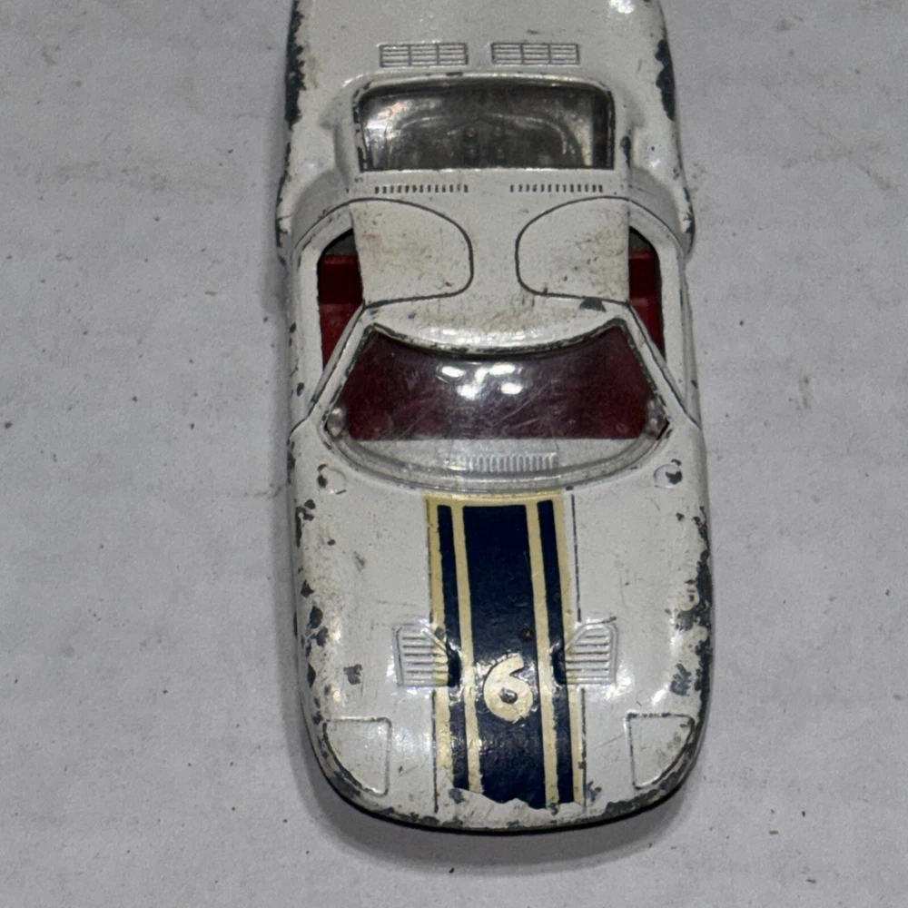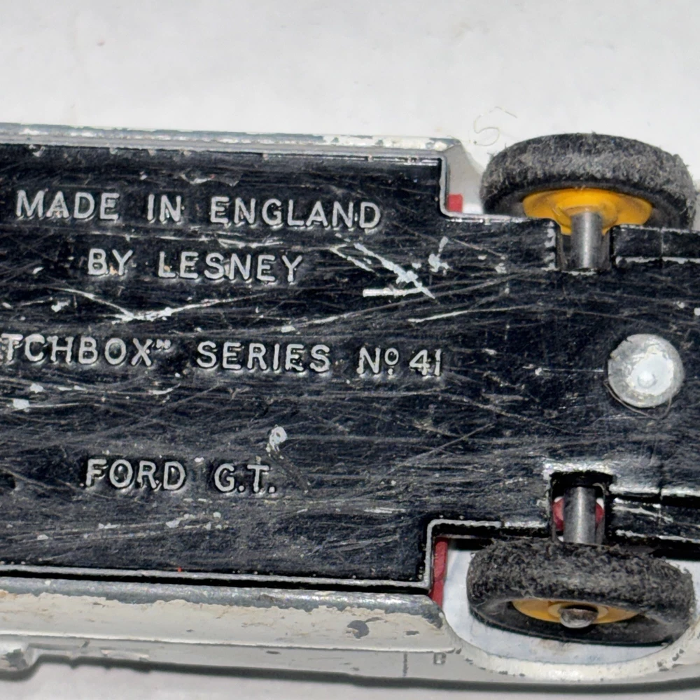 This is a vintage Matchbox Lesney Ford GT Racer #41 diecast car from the 1960s. It is in white color with yellow hubs, representing a classic Ford model. The 1:64 scale model is a part of the Matchbox Lesney series and was manufactured in England/UK. This collectible toy car is suitable for children aged 3 and up, as well as collectors interested in vintage diecast vehicles.