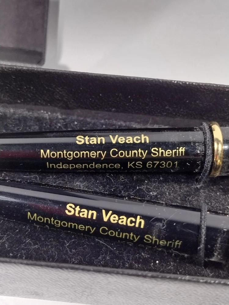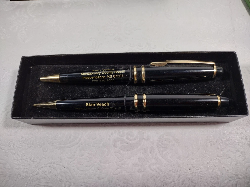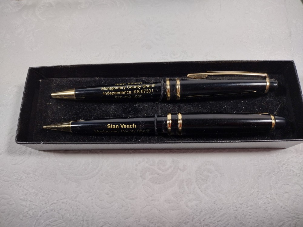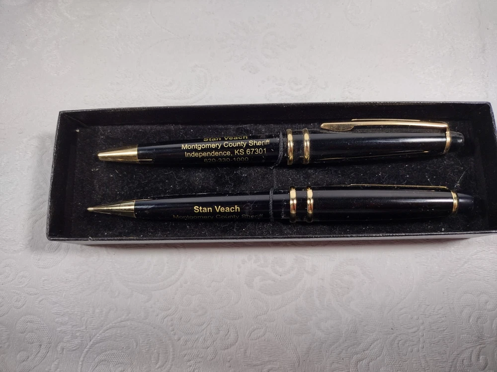 New pen and pencil set in the Box written on them is Dan Veach Montgomery county sheriff Independence Kansas XXXXX phone number 620-XXX XXXX. this guy either is it currently the sheriff or running for sheriff either way it is advertising for the sheriff's department. And they work these pins his pin and pencil works