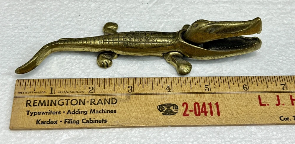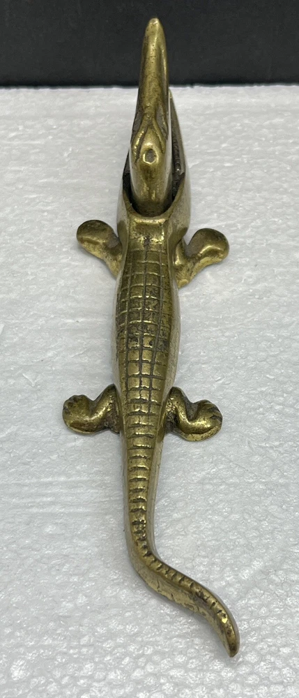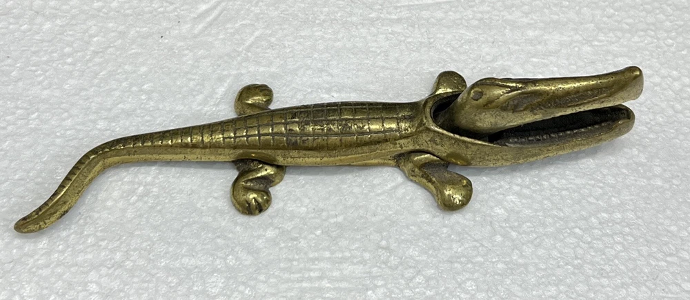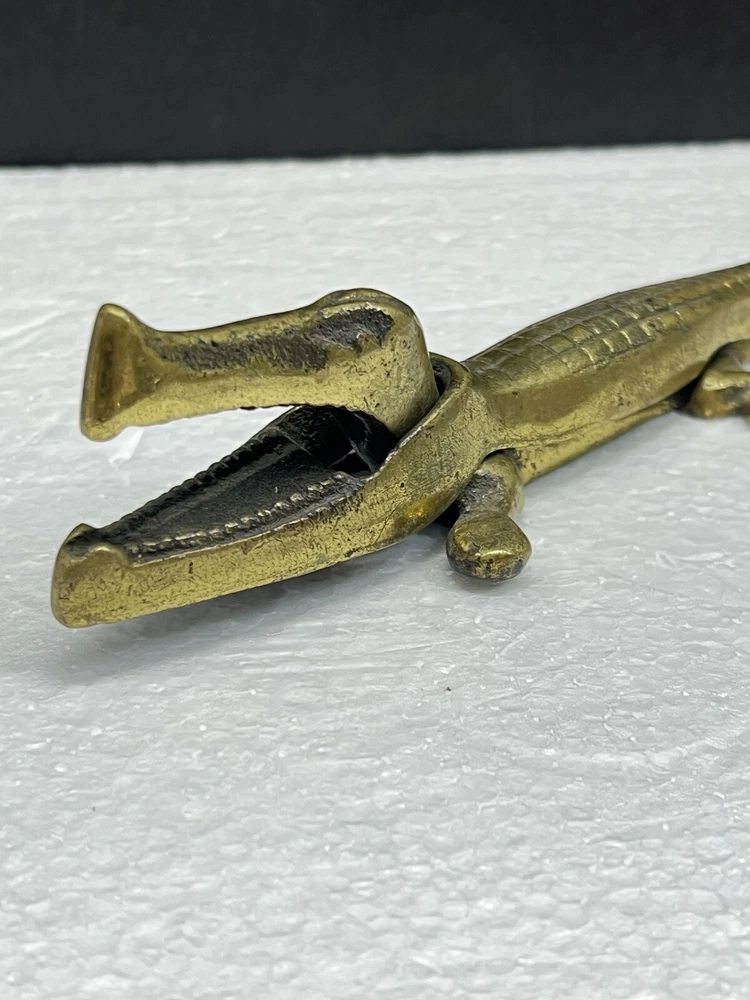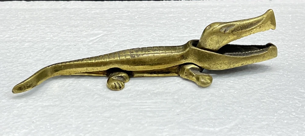 Nice Vintage Solid Brass Alligator Shaped Figural Nutcracker Measures approx. 6 1/2" long This one isn't made with a hinge, the top actually just slips over the bottom part of the body to interlock. Please see my pictures and ask any questions. WE WILL DEFINITELY COMBINE SHIPPING ON ANY OF OUR AUCTIONS IF SAFELY POSSIBLE! PICK YOUR ITEMS OUT AND I WILL SEND A COMBINED INVOICE.