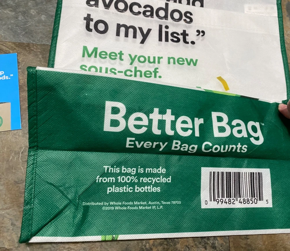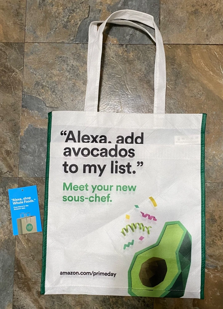 Here is a terrific find. This is a reusable shopping bag/tote bag from Whole Foods Market. This bag was created to celebrate Amazon Prime Day in 2019 and encourages using Alexa to shop Whole Foods. One side features an outside pocket as well. Made from recycled plastic bottles. Includes original paper hang tag, as shown (detached). Approx. 13-1/2 wide x 15-1/2 tall (not counting handles). From my personal collection and stored since new, this is in excellent condition - never used to carry anything! (NOTE: This will ship folded with tissue to prevent further creasing.) A great bag to use - or add to your shopping bag collection!