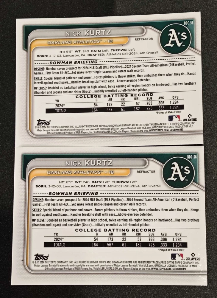 Nick Kurtz 2024 Bowman Chrome Draft 1st Refractor Athletics #BDC-56 Lots2 HD
