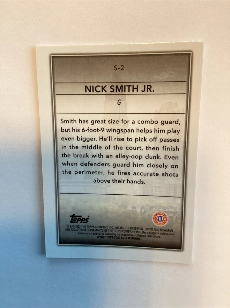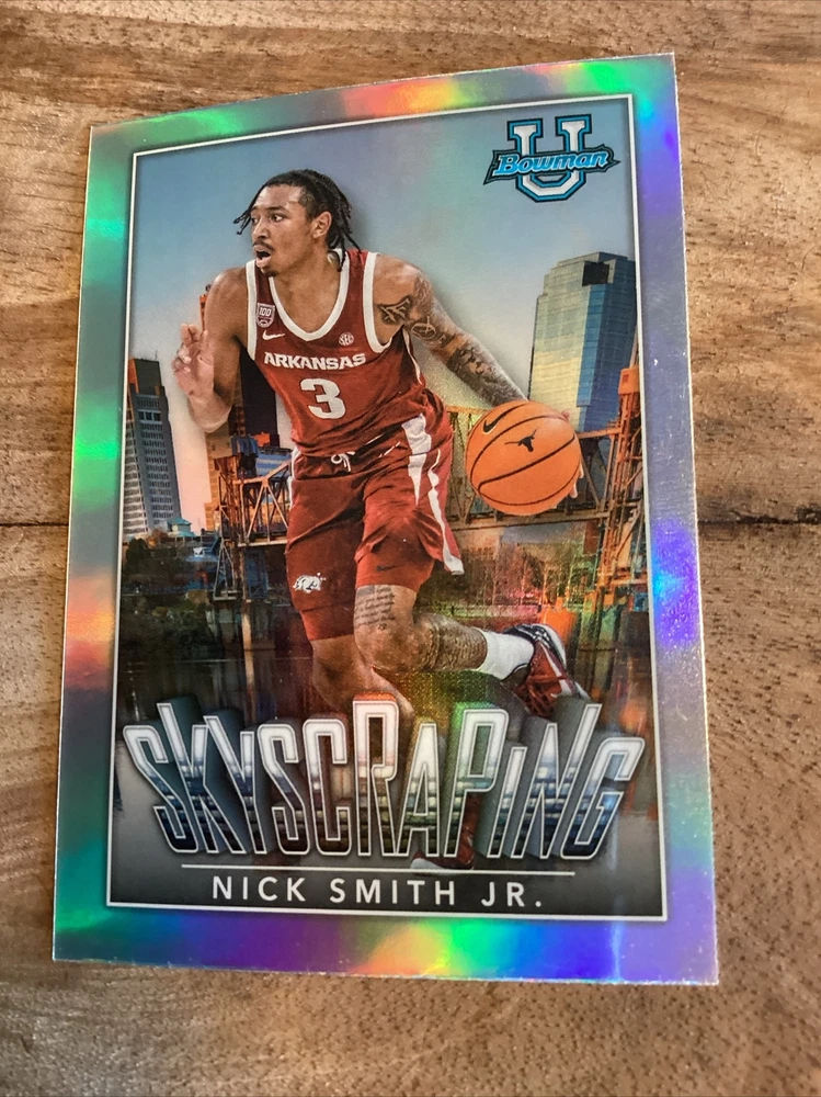 Nick Smith Jr. 2022-23 Bowman U Chrome Skyscraping trading card manufactured by Topps. The card features the Arkansas Razorbacks and Charlotte Hornets player in his college uniform. The card number is S-2 and it is an original licensed reprint. The card is part of the Skyscraping parallel/variety.